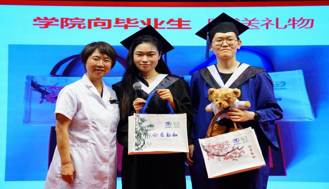 儿科医学院为毕业生准备了小熊手伴并精心打造了专属的“毕业礼盒”,其中包含笔记本、卡片夹和徽章。每件物品都精心镌刻着国家儿童医学中心、北京儿童医院的院训、建筑以及海棠等核心文化元素。帆布袋上,盛放的海棠与虚心劲节的翠竹,象征着学院对学子们节节高升的真挚祝福与高尚气节的期许。王爱华副院长将这份凝聚了儿科医学院全体老师辛勤付出与美好祝愿的毕业礼物,郑重地交予毕业生代表,并殷切嘱托他们牢记儿医院训,为儿童健康事业不懈奋斗!
