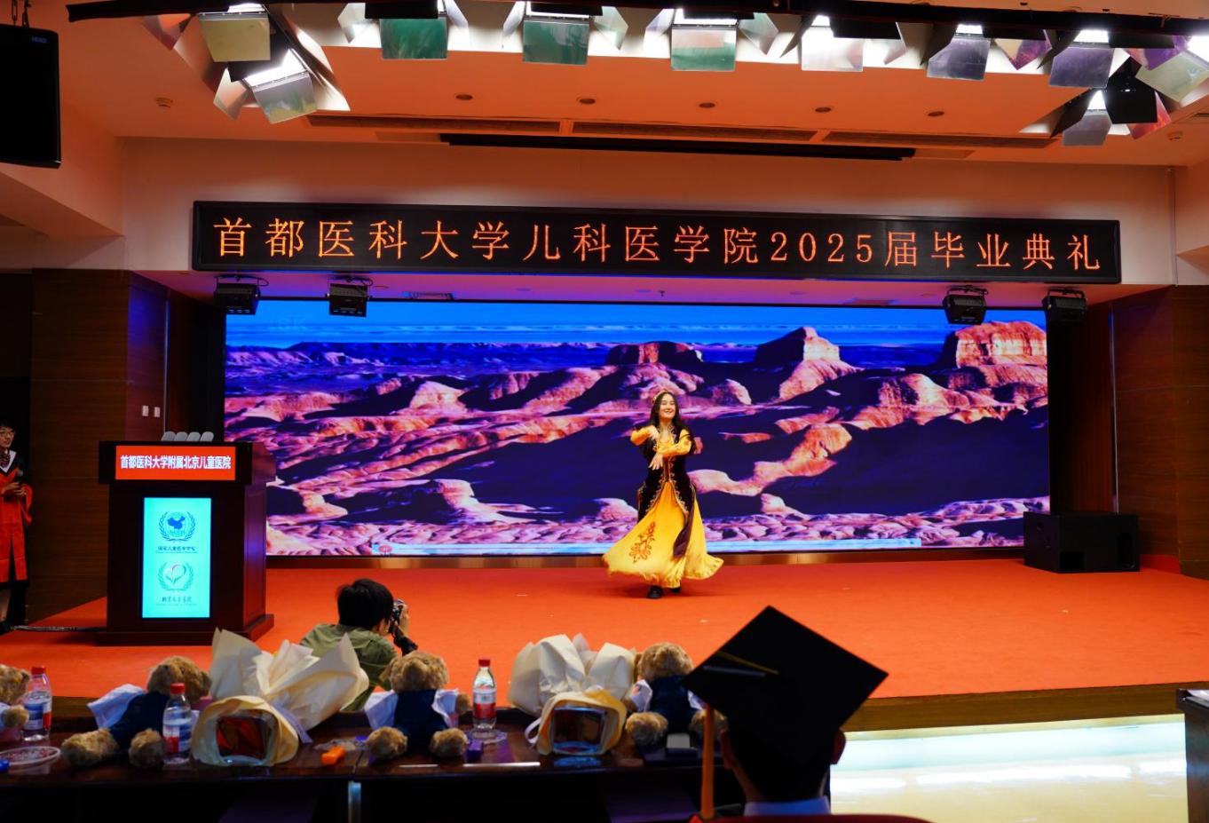 毕业生们现场准备了精彩纷呈的节目。辅导员黎金彪老师与硕士生孟义然同学合唱《稻香》,传递出学业耕耘的甘甜与收获的喜悦,两只活泼灵动的青蛙玩偶登场,为现场增添了浓浓的热烈气氛。硕士生迪拉热·迪力木拉献上新疆舞蹈《跃动的琴弦》,将天山脚下的热情与豪迈展现在大家眼前。博士班张志一、温煦与硕士班邵子坤、夏钰洁同学,携手带来改编歌曲《亲爱的医生啊》,带领同学们在熟悉的旋律中重温逐梦的温暖与力量。现场荧光灯摇曳闪烁,汇聚成一片璀璨的星辰大海。