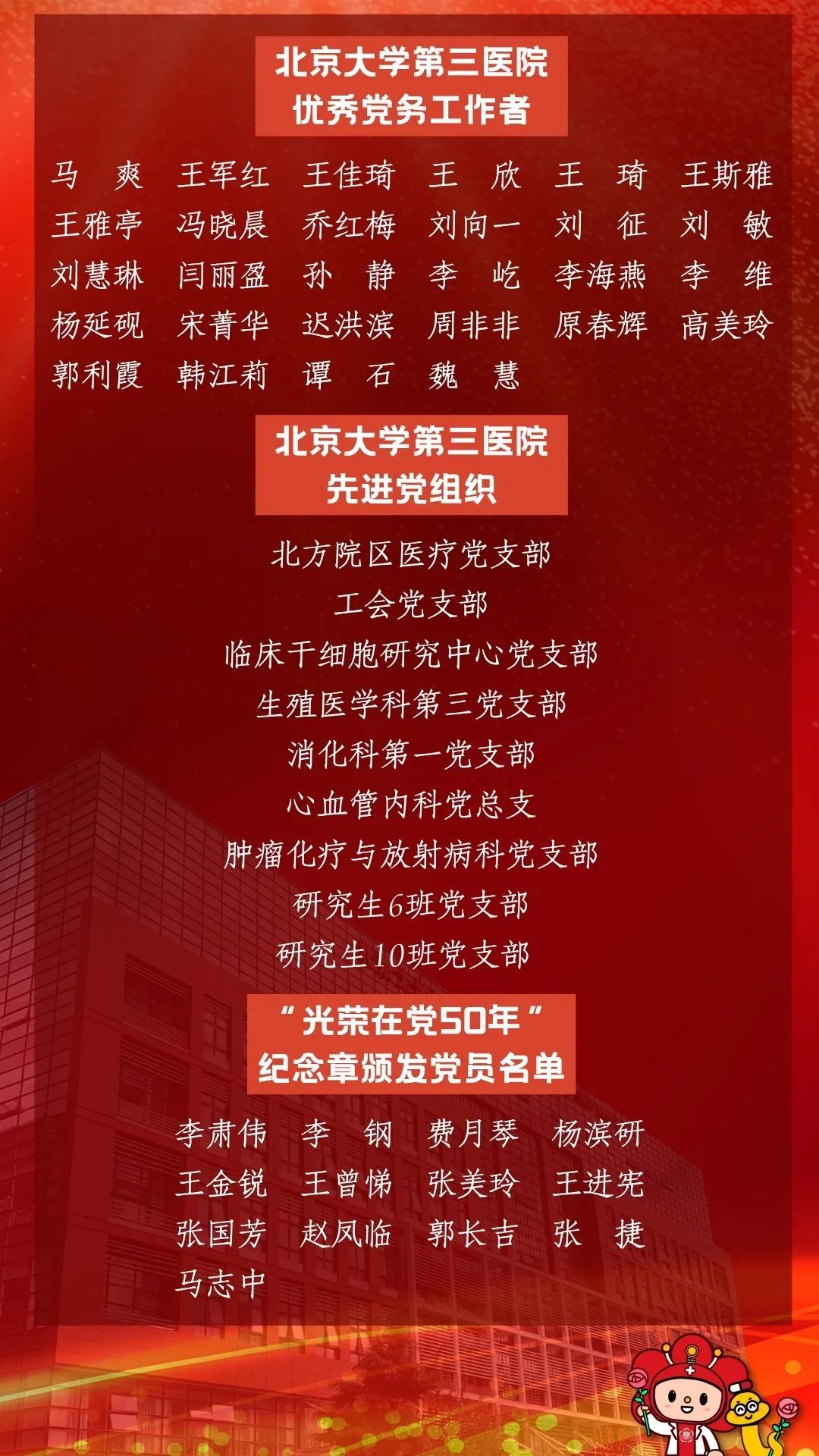 北京大学纪委副书记、医学部党委副书记、纪委书记王军为,北京大学第三医院党委书记金昌晓,院长、党委副书记付卫等党政班子成员、党委委员、纪委委员出席大会。受表彰的优秀个人和先进集体代表、党支部书记和党员代表,民主党派代表等参加会议。会议由北京大学第三医院党委副书记姜雪主持。