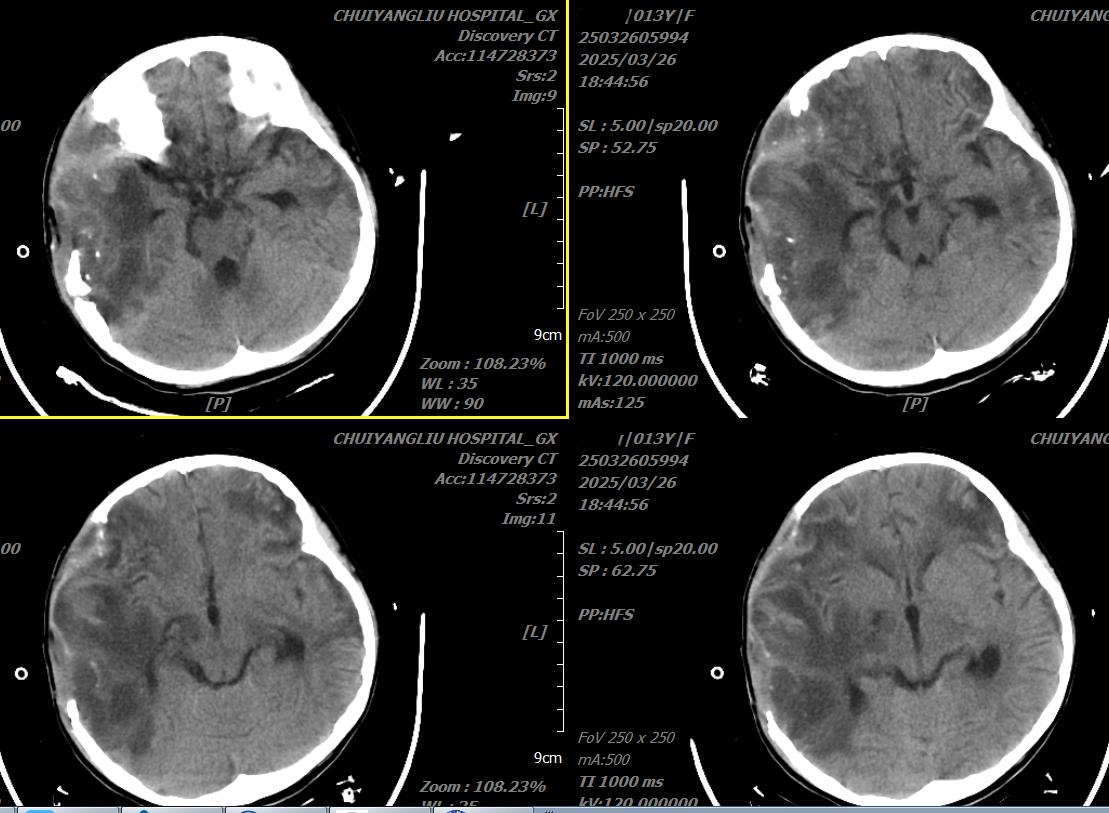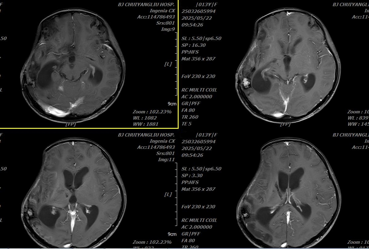 娉娉袅袅十三余,豆蔻梢头二月初。十三岁对于一位少女来说,本应当是在操场上肆意挥洒汗水的花样年华。可这些对于3个月前的小雨来说曾一度不可能。今年2月份的时候,小雨在上学途中,被汽车撞伤,伤后当即意识昏迷。于当地医院急行“右侧开颅脑内血肿清除术+硬膜外血肿清除术+去骨瓣减压术+颅内压探头置入术”。术后一直于深昏迷状态,于2025年3月13日行气管切开。患儿外伤较重且合并肠梗阻,持续胃肠减压、静脉输营养液。术后出现高热,于2025年3月25日于外院行头颅增强MRI示“术区、脑膜及右颞部软组织多发强化,考虑感染性改变”,考虑颅内脓肿、颅内感染。为进一步治疗,患者家属经多方打听后,前来清华大学附属垂杨柳医院神经外科寻求帮助。