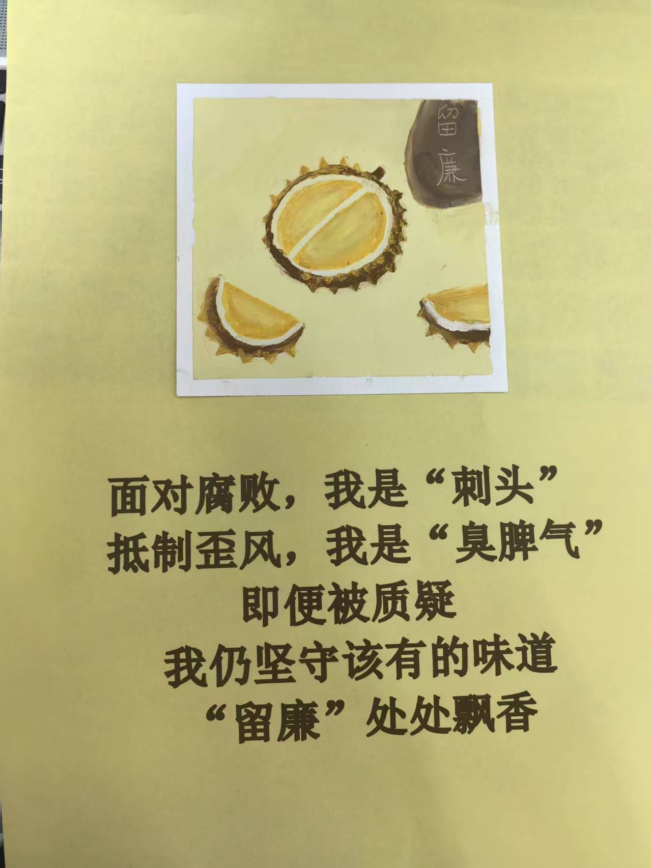 作品简介:面对腐败,我是“刺头”;抵制歪风,我是“臭脾气”。即使被质疑,我仍坚守该有的味道,“留廉”处处飘香。