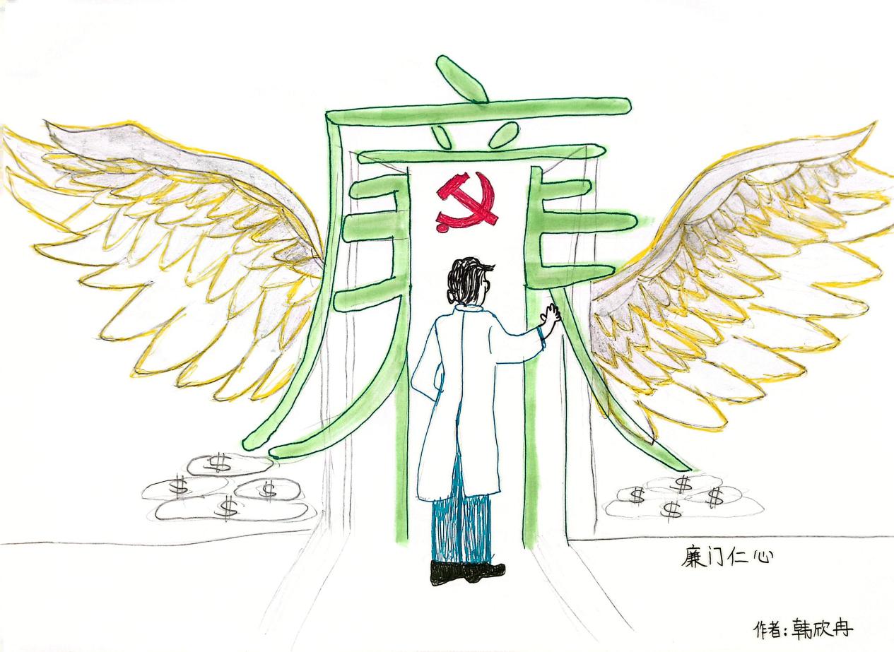 作品简介:作品以医疗行业为切入点,通过视觉象征构建"廉洁行医三重境界":破贪立廉(跨越金钱诱惑之门)、使命铸魂(党徽指引职业初心)、清风护航(廉洁之翼赋能新篇),将医疗反腐的现代命题融入传统门扇符号,以"推门入廉"的动作语言昭示:廉洁不是禁锢的牢笼,而是让仁心破茧成蝶的通途!