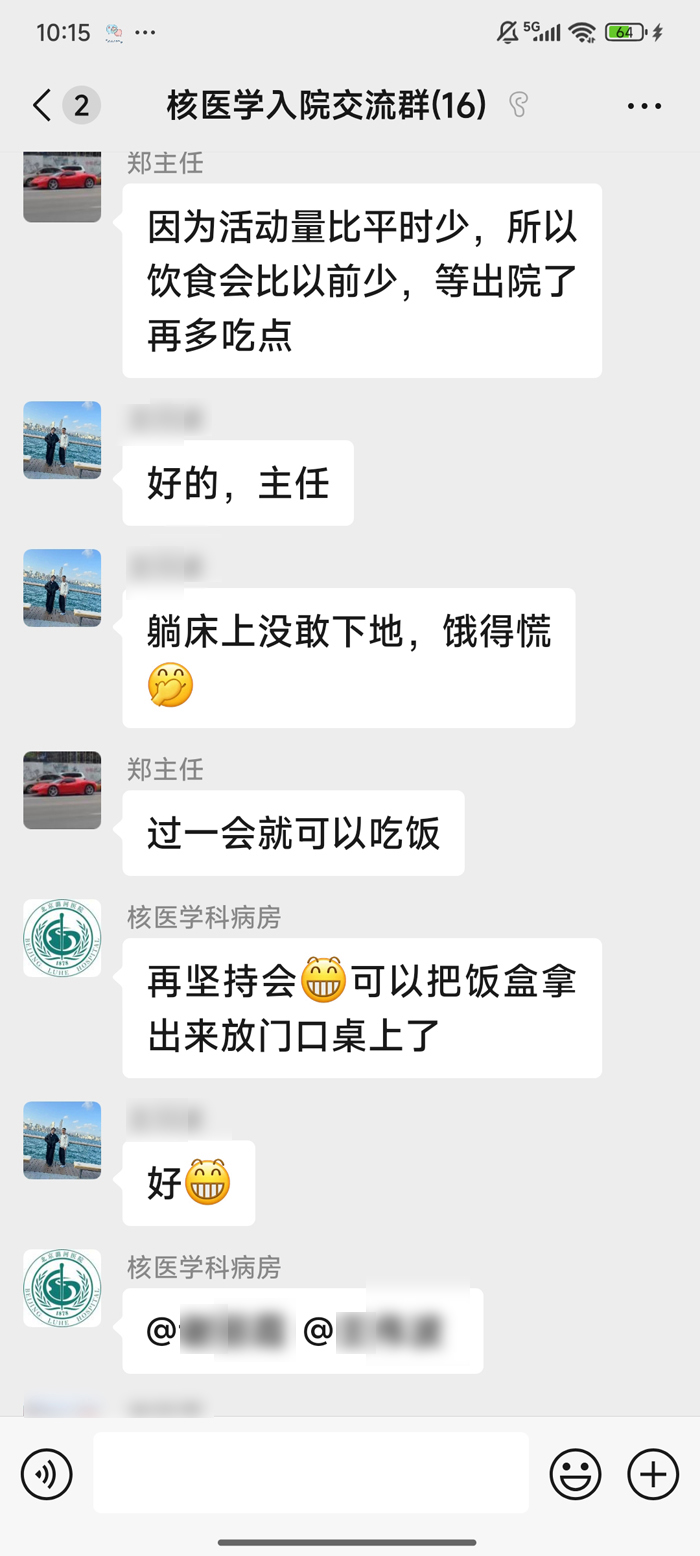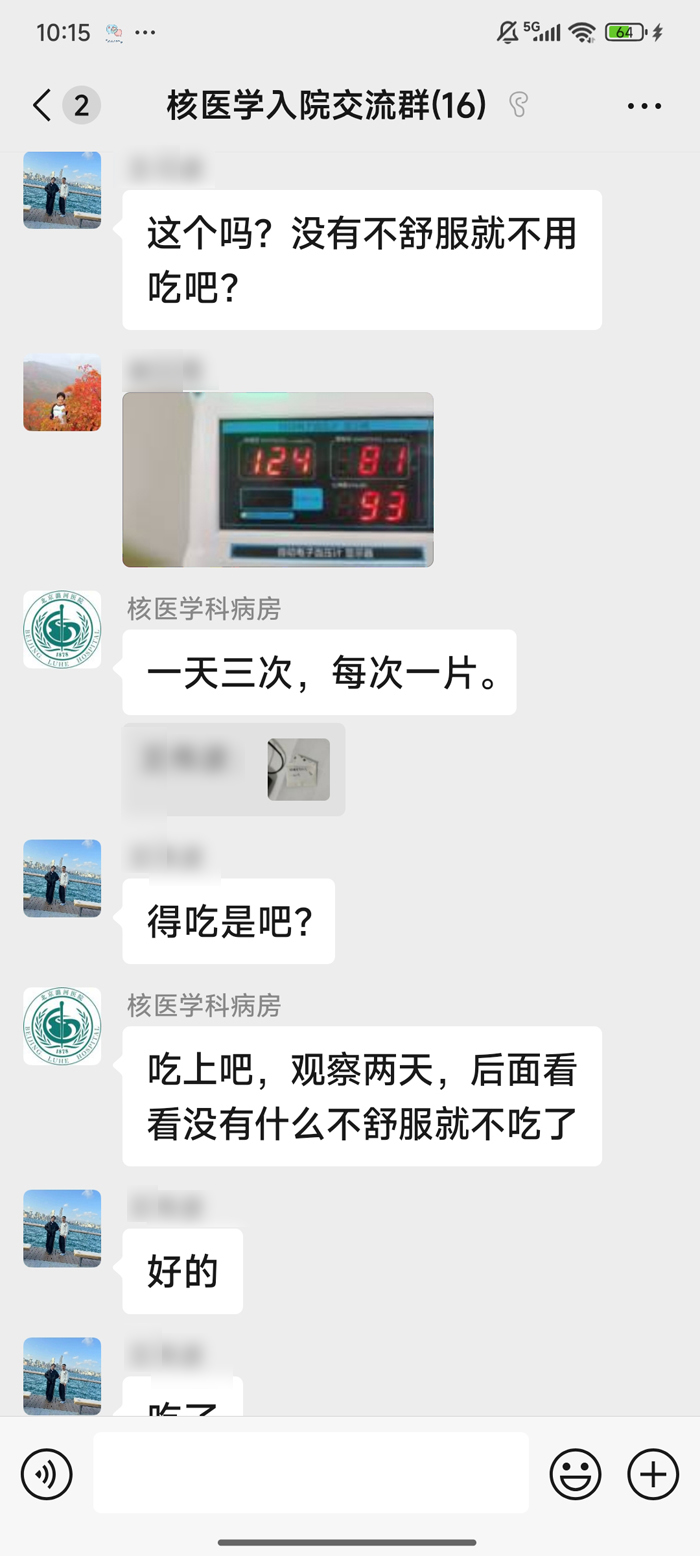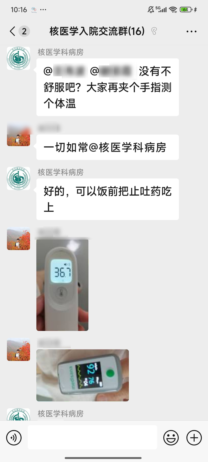 在连续两天肌肉注射rhTSH后,三位患者的化验结果显示TSH水平均达到治疗要求,顺利办理入院。郑立春根据三位患者病情,分别制定了个体化治疗方案。护士根据治疗方案分别给予他们治疗量碘131胶囊,用药后三人回到核医学科核素隔离病房进行隔离。住院期间,医护人员专门建立医患沟通微信群,每日在微信群里监督三人测量血压、心率等,嘱咐他们多饮水、多排尿,并及时回复他们的询问和需求。两天后,三位患者体内残留放射性活度符合出院标准后,先后顺利出院。