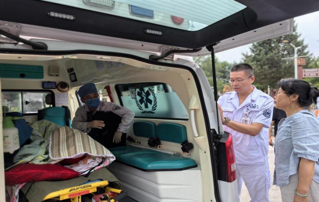 苹果园急救站的王坤车组第一个抵达转运点。盛夏的闷热裹挟着焦虑,他们却迅速沉下心来:在区卫生健康委的统筹下,迅速为老人完成血压、血氧、心肺功能评估等病情评估。