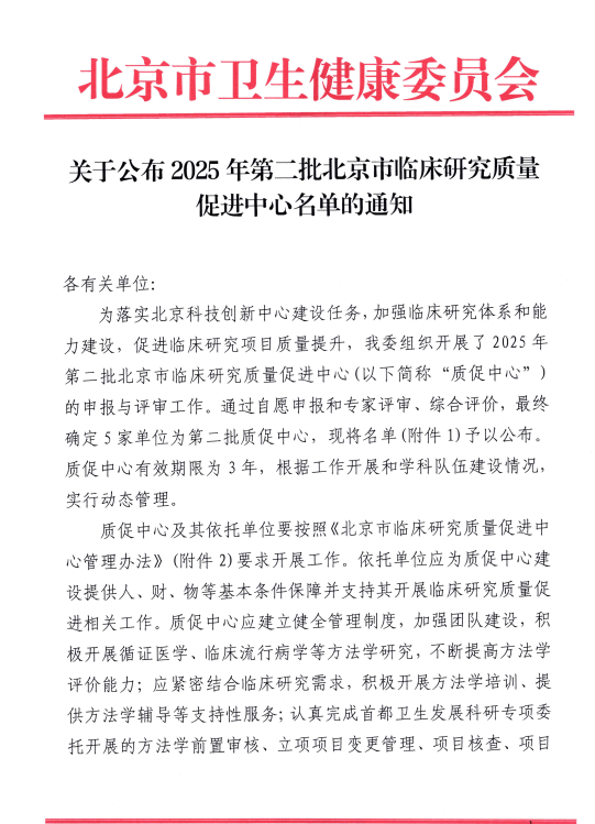8月5日,北京市卫生健康委员会(以下简称市卫健委)公布了2025年第二批“北京市临床研究质量促进中心”认定名单,北京中医药大学东方医院(以下简称东方医院)在临床研究质量促进中心主任商洪才研究员的带领下,凭借突出的临床研究综合实力与完善的质量管理体系,再次成功获批,成为全市临床研究质量促进核心机构之一。