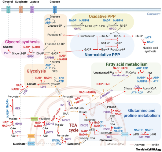 2.系统论述NADH还原压力驱动代谢重编程的机制:NADH是细胞内主要的电子载体,在NADH还原压力条件下,细胞会启动代谢重编程,作为恢复氧化还原平衡的补偿反应,包括葡萄糖代谢、脂质代谢、氨基酸代谢和核苷酸代谢等。