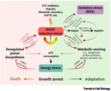3.探讨NADH还原应激与氧化、能量应激的交互作用:NADH还原应激驱动代谢重编程能够引发多种下游反应并决定细胞命运。而细胞命运的最终结果取决于对NADH还原压力的下游反应之间的相互作用。