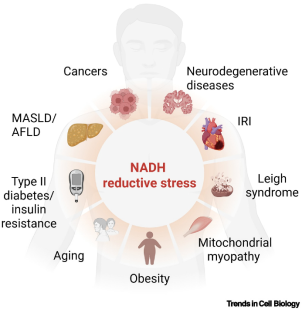 4. NADH 还原性应激与人类多种疾病的发病机制密切相关,包括代谢功能障碍相关性脂肪肝(MASLD)、酒精性脂肪肝(AFLD)、癌症、神经退行性疾病、缺血再灌注损伤(IRI)、利氏综合征、线粒体肌病、肥胖、衰老和伴有胰岛素抵抗的2型糖尿病等。