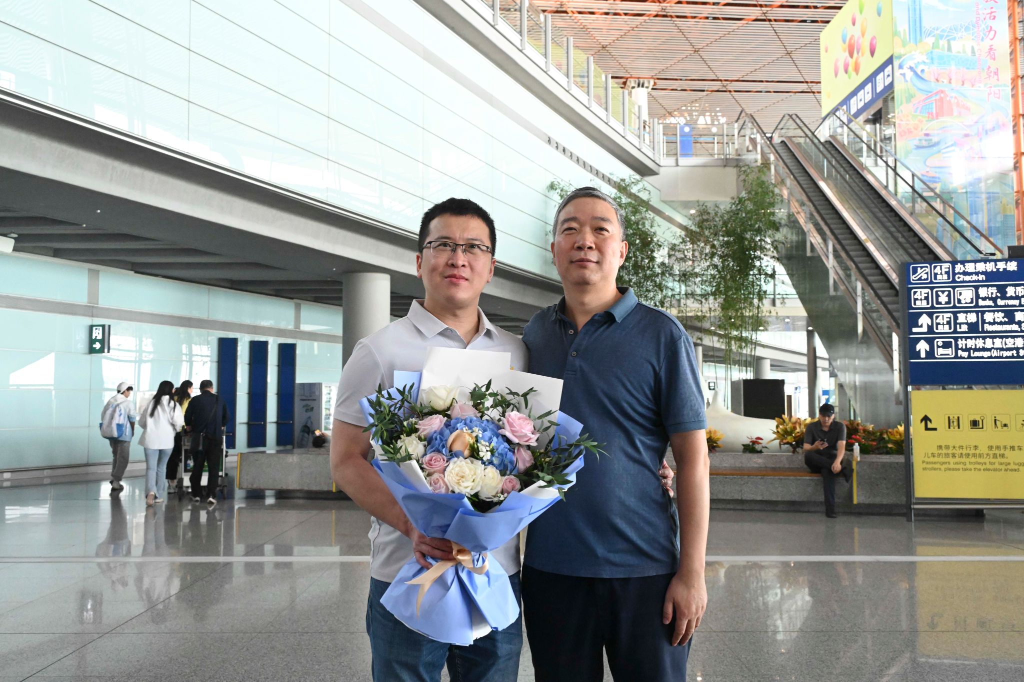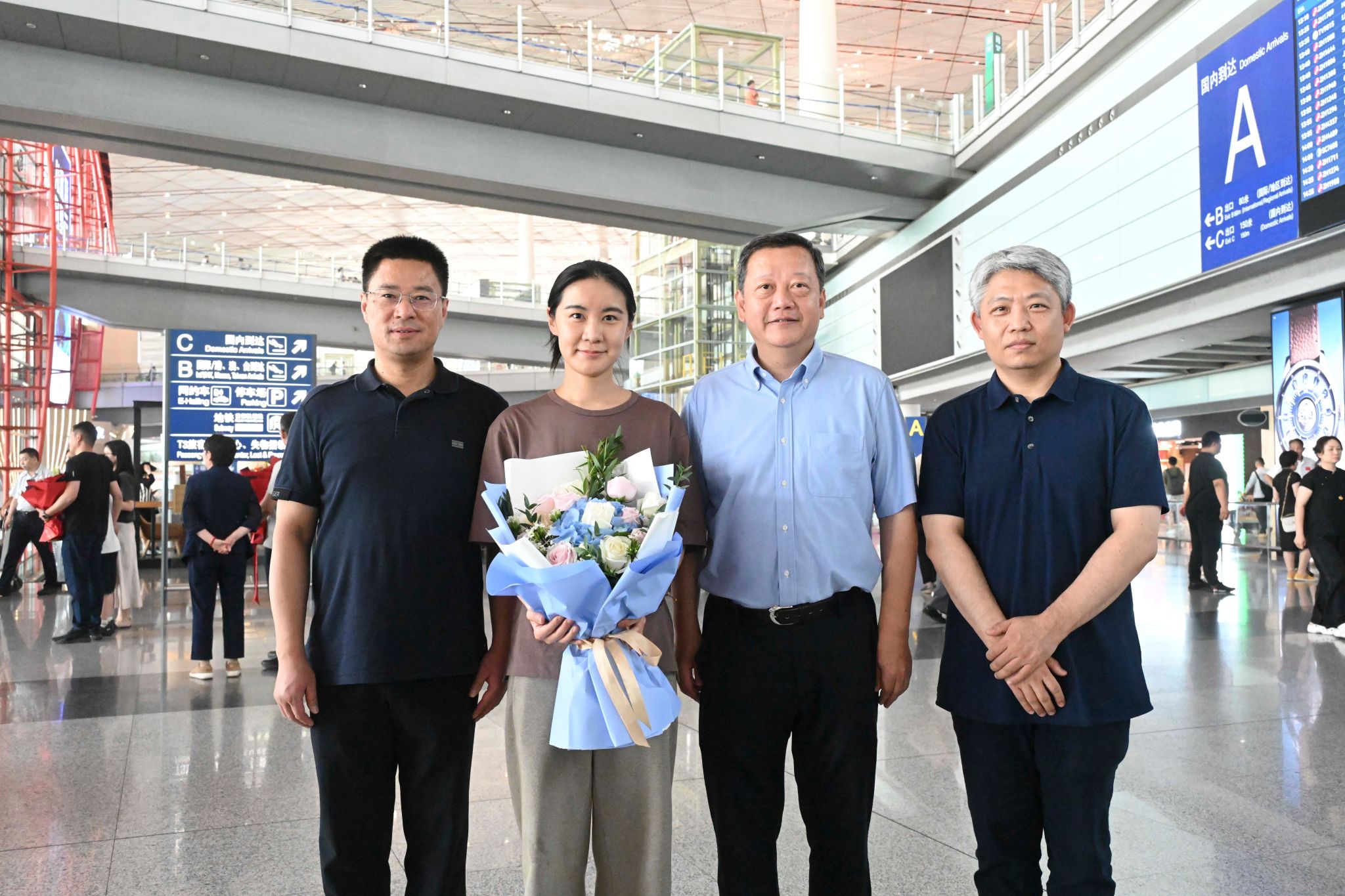 下午1时许,党委副书记、纪委书记陈红松带领党院办、医务处、人事处、工会、宣传中心等职能部门代表、队员所在科室领导、同事、家属们早早来到首都国际机场T3航站楼,手捧鲜花,等待队员归来。