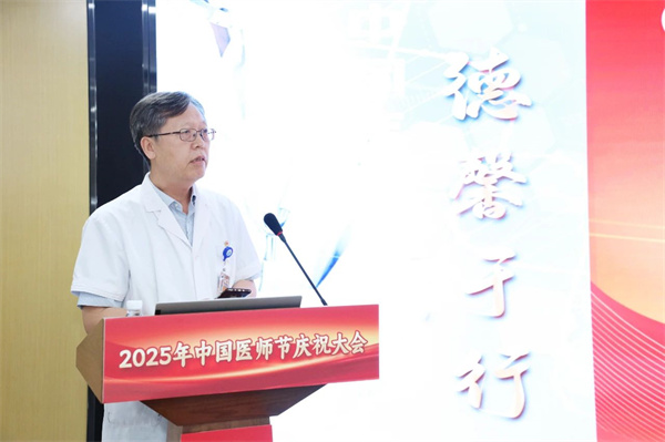 党委书记朱烨烽代表院党委向全院医师同仁及离退休老同志致以崇高的敬意和节日的问候!朱烨烽高度肯定了医师团队在医疗质量提升、专科建设、技术创新等方面取得的突破性成果,并向全体医师提出三点祝愿和倡议:一是永葆赤诚之心,勇担时代使命。以习近平新时代中国特色社会主义思想为指引,将“人民至上、生命至上”理念贯穿诊疗全过程,做健康中国的践行者。二是以德术为双翼,铸就仁心仁术。恪守医德医风,严守纪法红线,钻研前沿医术,提升服务质量,做患者信赖的“苍生大医”。三是凝聚发展合力,共绘发展新篇。胸怀大局、团结协作,以资源共享促优势互补,以人文关怀筑医患和谐,推动医院医教研管协同发展。