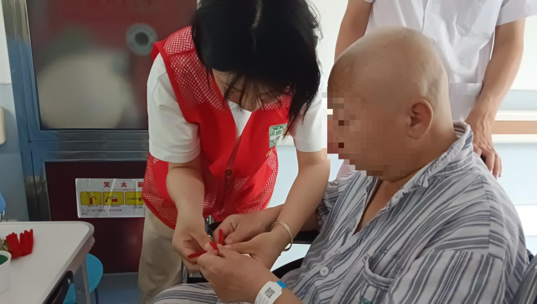 “指尖花语”环节,彩色扭扭棒在指尖翻飞。社工特意挑选了象征坚韧的薰衣草和代表希望的向日葵,手把手教大家塑形。制作过程中,社工与医护默契配合,为操作不便的患者提供协助。在专注的手工创作中,患者的就医焦虑得以舒缓,而医患间的协作互动更让“治疗伙伴”的关系悄然深化。