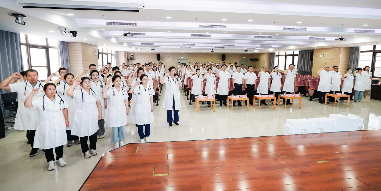第六个环节,与会领导为新入职员工代表佩戴听诊器,寓意着新员工的从医生涯正式开启,随后在新入职员工的领誓下,全体医师一同重温了医师誓词。
