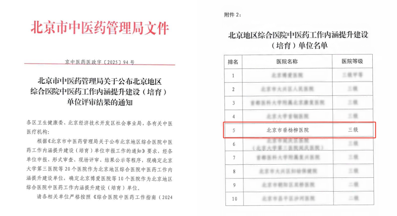 近日,北京市中医药管理局正式印发《关于公布北京地区综合医院中医药工作内涵提升建设(培育)单位评审结果的通知》(京中医药医政字〔2025〕94号),经单位申报、形式审查、现场评审、结果公示等规范程序,北京市垂杨柳医院成功入选“北京地区综合医院中医药工作内涵提升建设(培育)单位”,这一荣誉是市级主管部门对医院中医药工作基础、服务能力与发展潜力的权威肯定,为医院中医药事业高质量发展注入新动力。