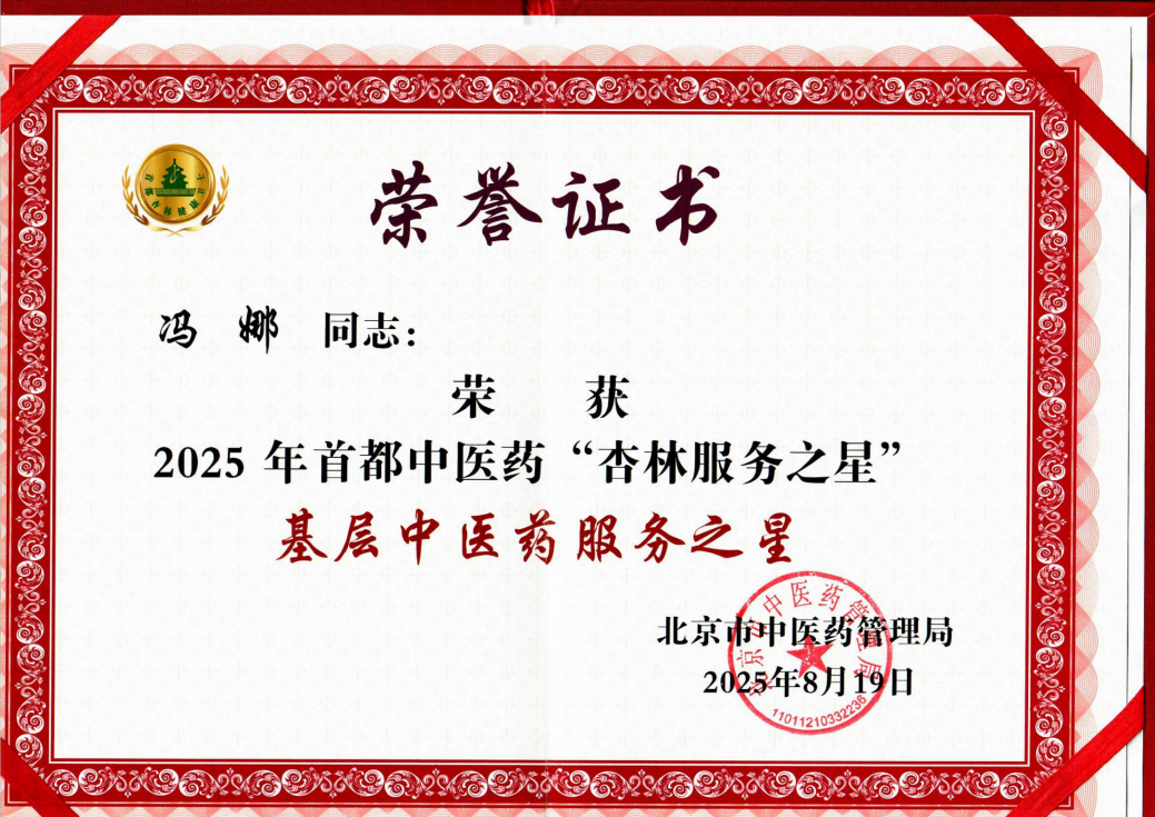 2025年8月19日第八个"中国医师节",北京市中医药管理局组织开展了2025年首都中医药医师节活动推荐工作。旨在弘扬中医药文化,展现首都中医医师的良好形象,经各单位推荐、专家评审等环节,石景山区五里坨街道社区卫生服务中心冯娜主任医师荣获首都中医"杏林服务之星"称号。