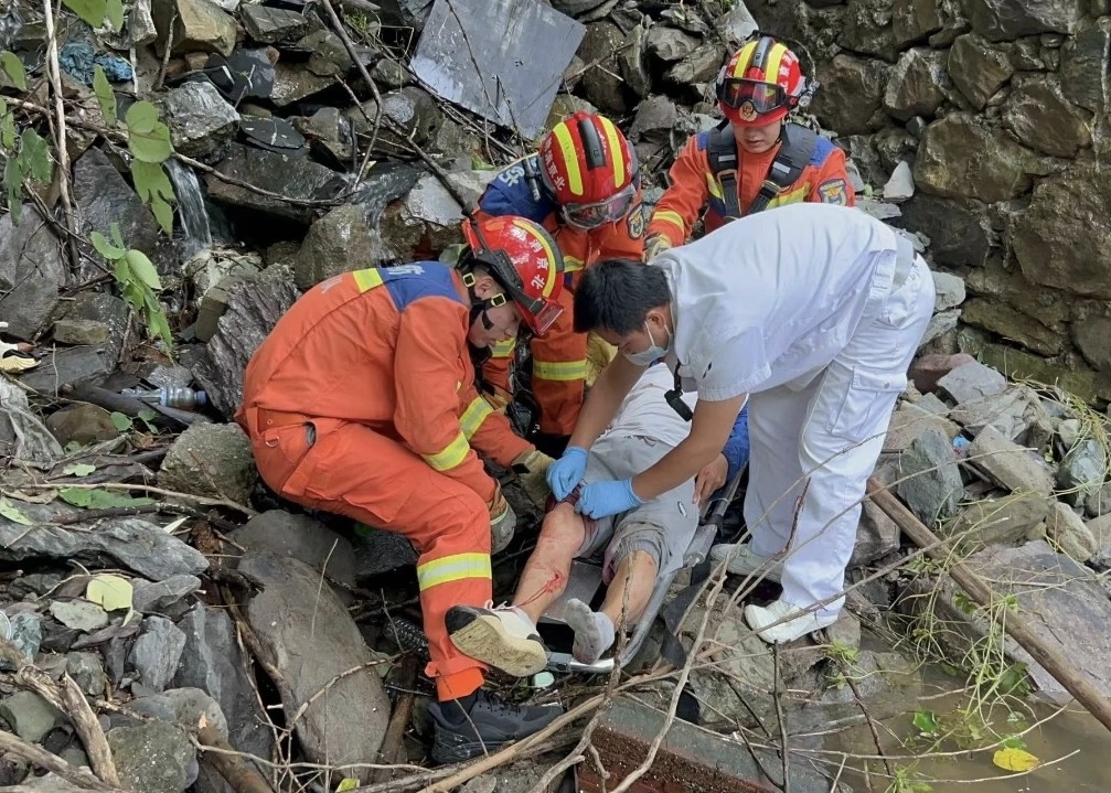 到达现场后,救援难度超出预期。事发地点地势陡峭,连日雨水让山体格外湿滑。王卫星医生与消防队员迅速评估现场,共同清理出救援通道。冒着滑坠的风险,王医生与消防员率先下到沟底,快速完成伤情评估。