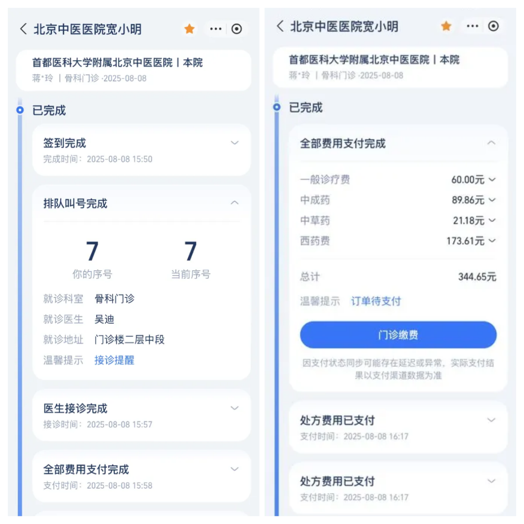 每到一个就诊节点,就会推送相应的信息,并可直接在手机上完成所需操作。比如,排队叫号可以实时在线查看叫号进度,合理安排时间。诊间的处方、检查检验等费用可以直接在线交费,目前也支持北京医保用户在线医保支付,不需要您再奔波于自助机或者收费窗口。