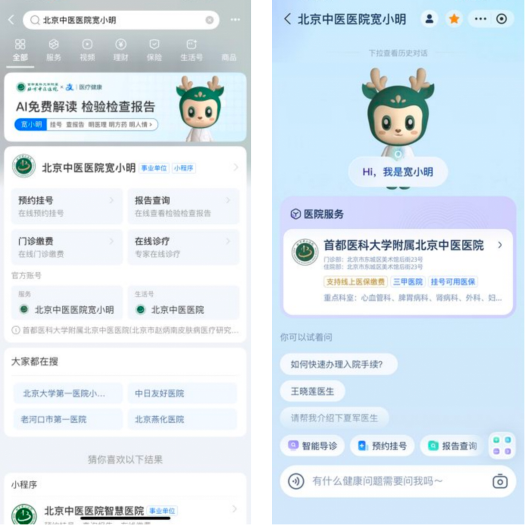 未来,当您有关于健康咨询、就诊需求、医院服务等任何问题,都可以第一时间上支付宝搜索”北京中医医院宽小明”,让可爱的健康数智人“宽小明”给您带来智能、轻松、贴心的就医体验。