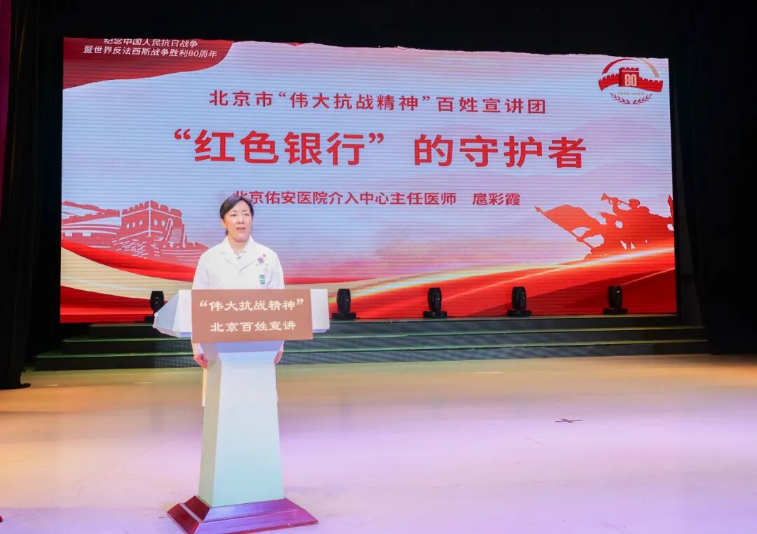 在纪念中国人民抗日战争暨世界反法西斯战争胜利80周年之际,北京市组建了“伟大抗战精神”百姓宣讲团,从百姓视角、百姓语言,让波澜壮阔的历史与可歌可泣的精神在新时代焕发光芒。在这场传承与致敬的活动中,北京佑安医院党委积极响应北京市卫健委的号召,向卫健委宣传处推荐肝病与肿瘤介入治疗中心主任医师扈彩霞,承载着家族的红色荣光与医者的职业使命,光荣地成为宣讲团的一员,用一段尘封的家族抗战史诗,为这场宏大的纪念献上深情厚礼。扈彩霞主任医师光荣成为北京市“伟大抗战精神”百姓宣讲团的一名成员,这不仅是其个人荣誉,更是对北京佑安医院深厚文化底蕴和社会责任担当的认可。她讲述的是其祖父扈金兰烈士在烽火连天的抗日战争时期,为守护党的“红色银行”所进行的英勇无畏、视死如归的斗争事迹。