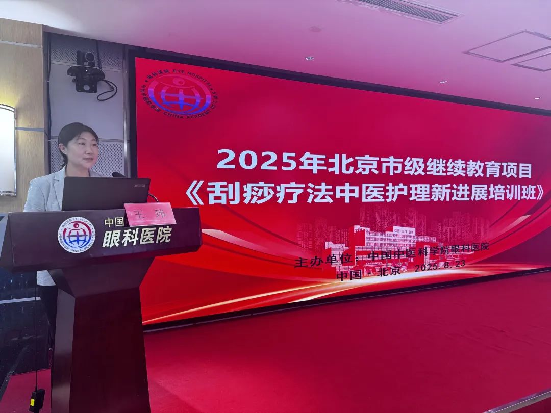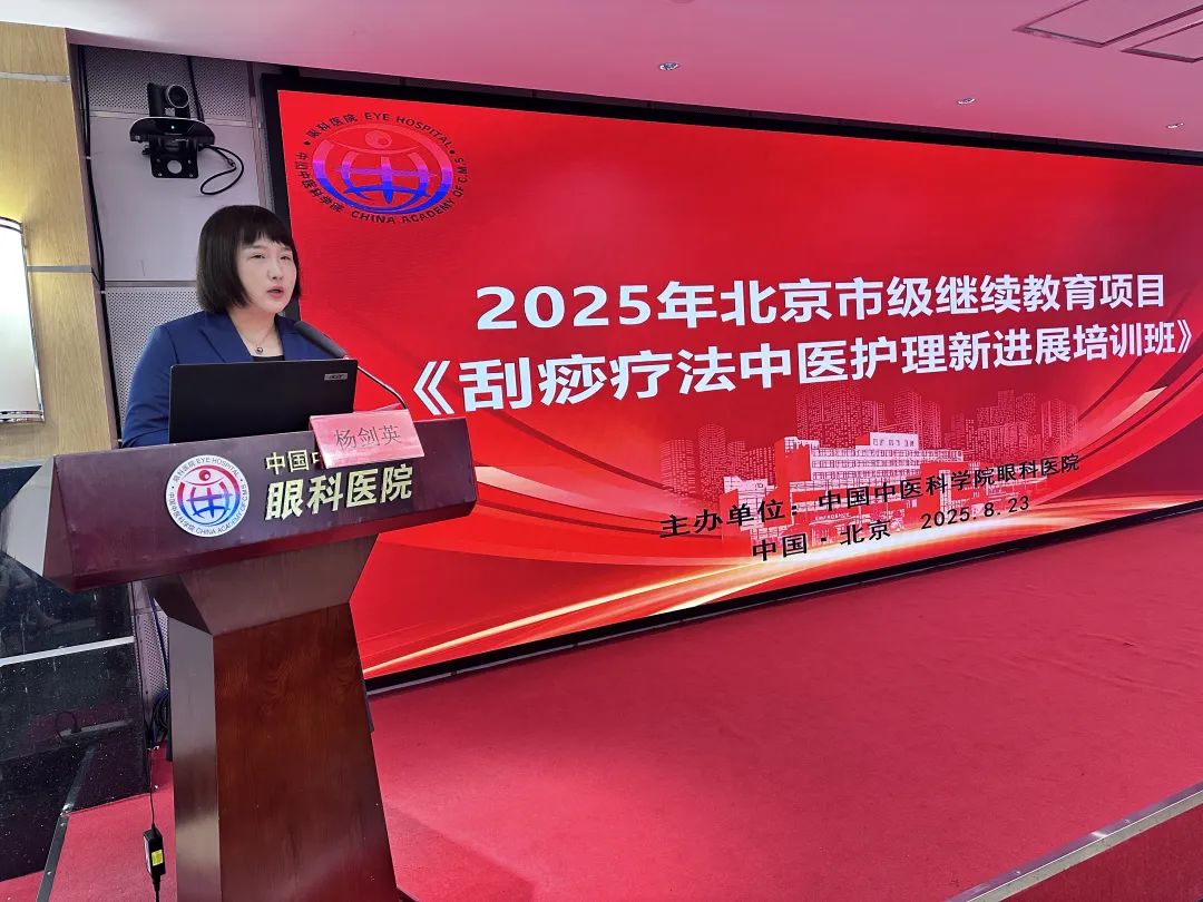 2025年8月23日,为进一步促进中医护理骨干人才的培养,加强重点专科建设,中国中医科学院眼科医院举办了“刮痧疗法中医护理新进展培训班”,吸引了全市20余家医疗机构的护理管理者与护理人员参加,共同探索刮痧疗法在中医护理领域的创新应用与实践路径。中国中医科学院眼科医院副院长李静出席培训并致辞,中国中医科学院眼科医院护理部科护士长杨剑英,护士长王玮主持培训。
