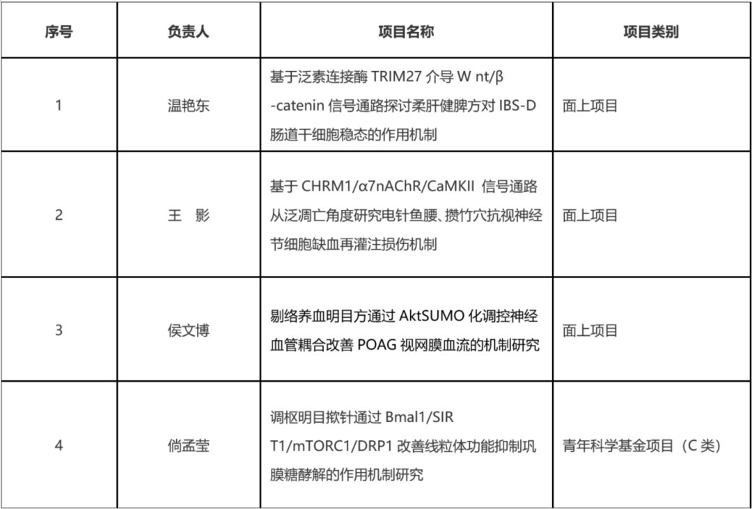 在2025年度国家自然科学基金项目申报中,中国中医科学院眼科医院积极响应国家创新驱动发展战略,系统组织全院科技人员参与申报工作。经过严格评审,医院共有4个项目获立项资助,其中包括面上项目3项和青年科学基金项目1项,展示了医院在中医药领域特别是中医眼科领域的扎实基础与科研实力。