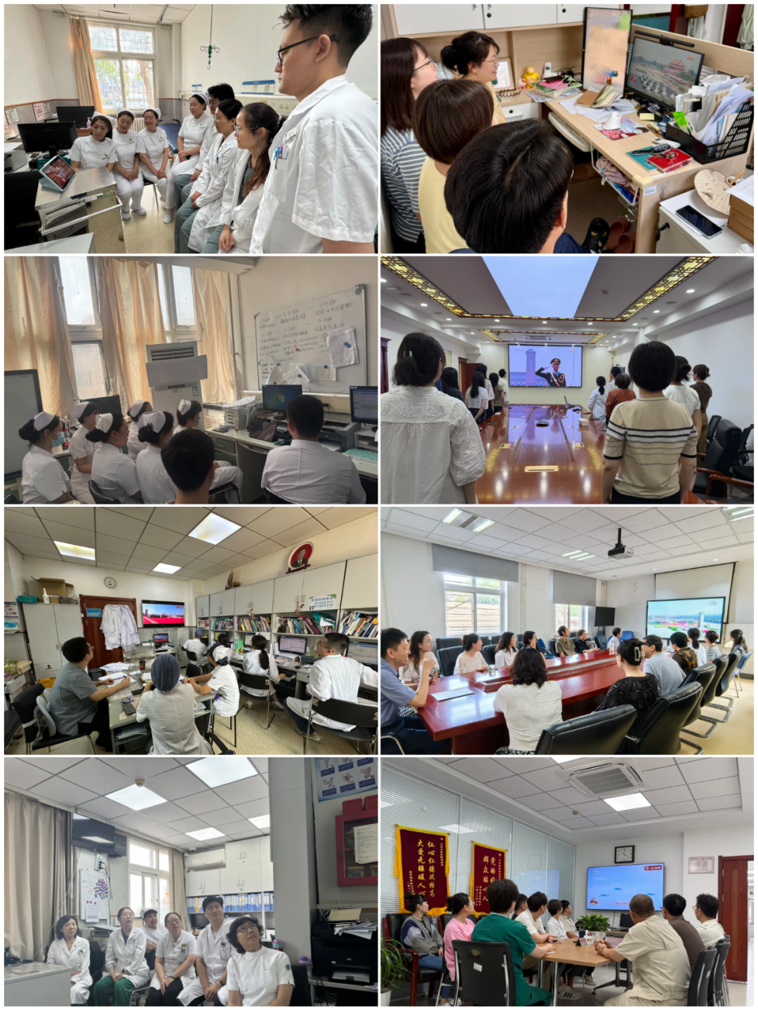 各科室职工在会议室、办公室等场所,通过电视、网络等渠道观看阅兵式。门急诊、药房一线医护人员在不影响正常诊疗工作的前提下也积极观看阅兵直播。