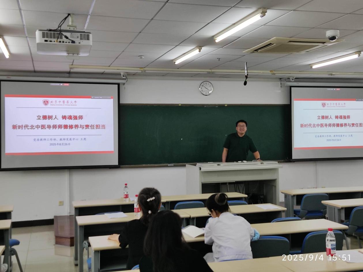北京中医药大学党委教师工作部、教师发展中心王鹰副部长围绕“立德树人,铸魂强师”主题,结合近期高校师德失范典型案例,深入浅出地解读了师德师风建设政策要求。他强调,导师要坚守“师德第一标准”,严守政治红线、法律底线和道德底线,对学生做到严管与厚爱相结合,营造风清气正的育人环境。