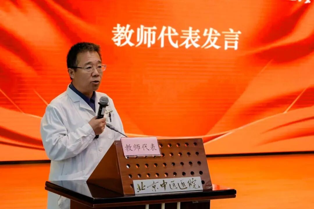 教师代表、中医外科学教研室主任徐旭英以“一袭白衣,双重使命”诠释医者师者本色。他深情回顾30余年从医执教历程,强调“德行是为师前提,大德曰生”,以“学为人师、行为世范”这一箴言激励教师们言传身教,师生携手为解除患者痛苦贡献力量。