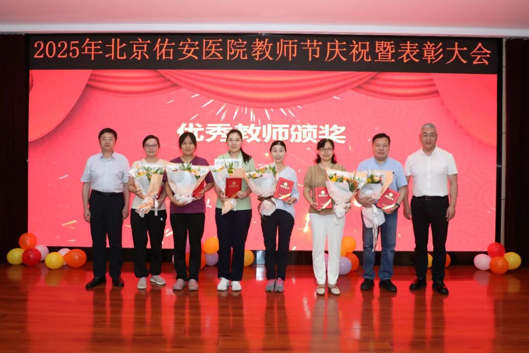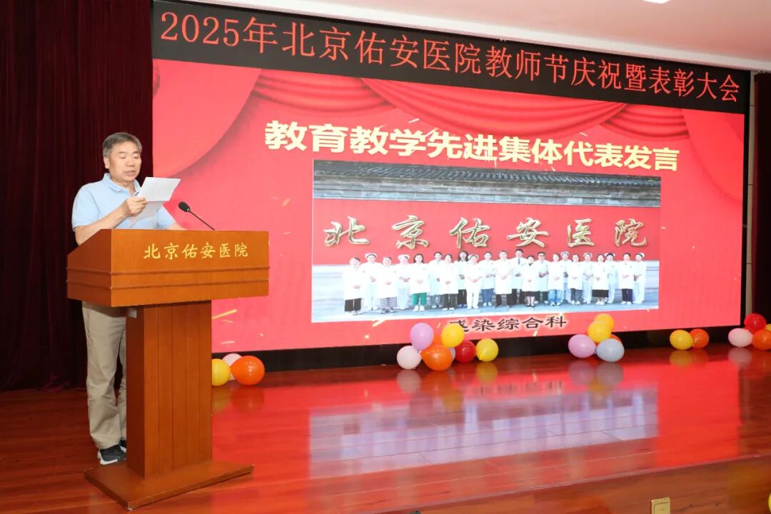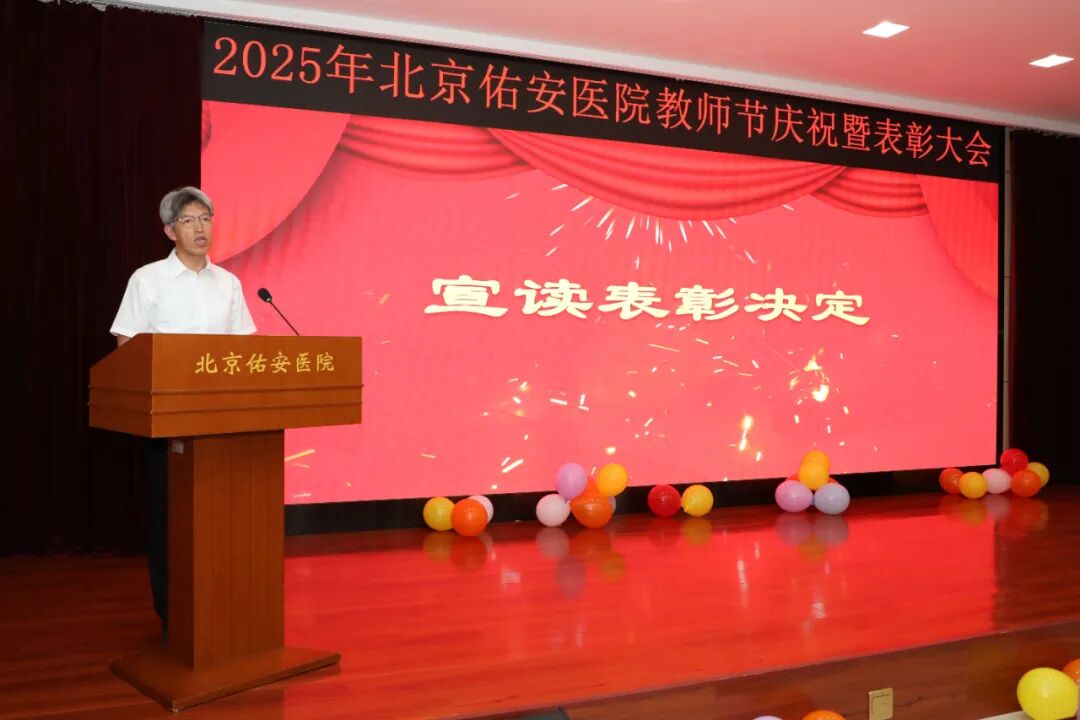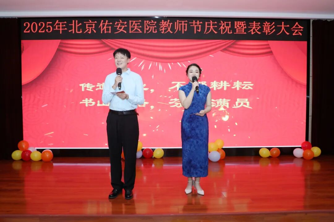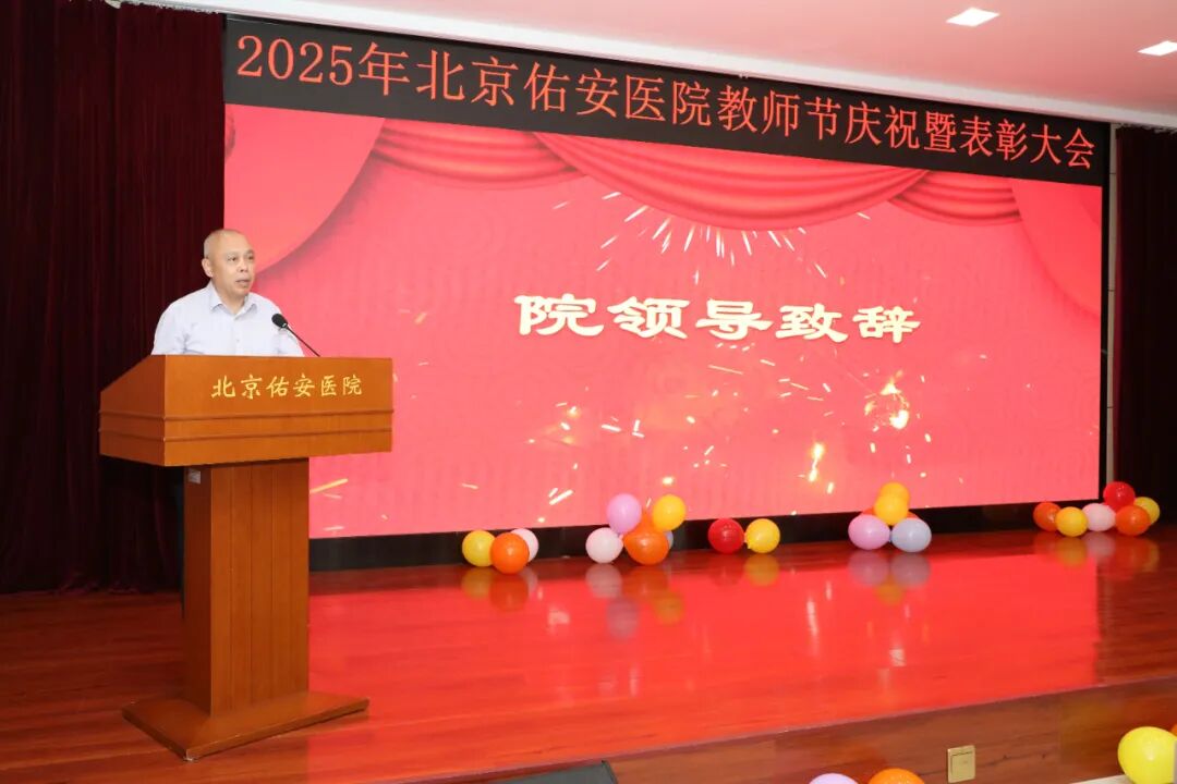 金风送爽,桂香沁人。在这充满感恩与敬意的美好时节,我们迎来了第41个教师节。2025年9月10日下午13:30,北京佑安医院报告厅内气氛热烈,2025年教师节庆祝大会暨教育教学表彰大会在此隆重举行。本次大会以 “大力弘扬教育家精神,加快建设教育强国” 为主题,党委副书记、院长马迎民,党委副书记、纪委书记王建敏,党委委员、副院长胡中杰,党委委员、副院长张永宏,副院长栗光明,党委委员、总会计师张春妮受邀出席。全体教师欢聚一堂,共庆属于自己的节日,大会由2024级博士研究生徐鹏、蔚家琪共同主持。