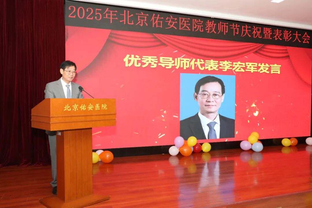 优秀教师代表放射科李宏军教授结合十五年教学实践经验,介绍了团队打造的“临床-教学-科研”三位一体培养模式;同时倡导“专业维度(终身学习更新知识)、社会维度(强化公共卫生责任)、精神维度(坚守医学人文精神)”的三维度职业发展育人理念,助力学子全面成长。他在发言中深情表示,愿继续以无私奉献的精神深耕医学教育领域,将医学教育的火炬不断传承下去,照亮人类健康事业的未来。