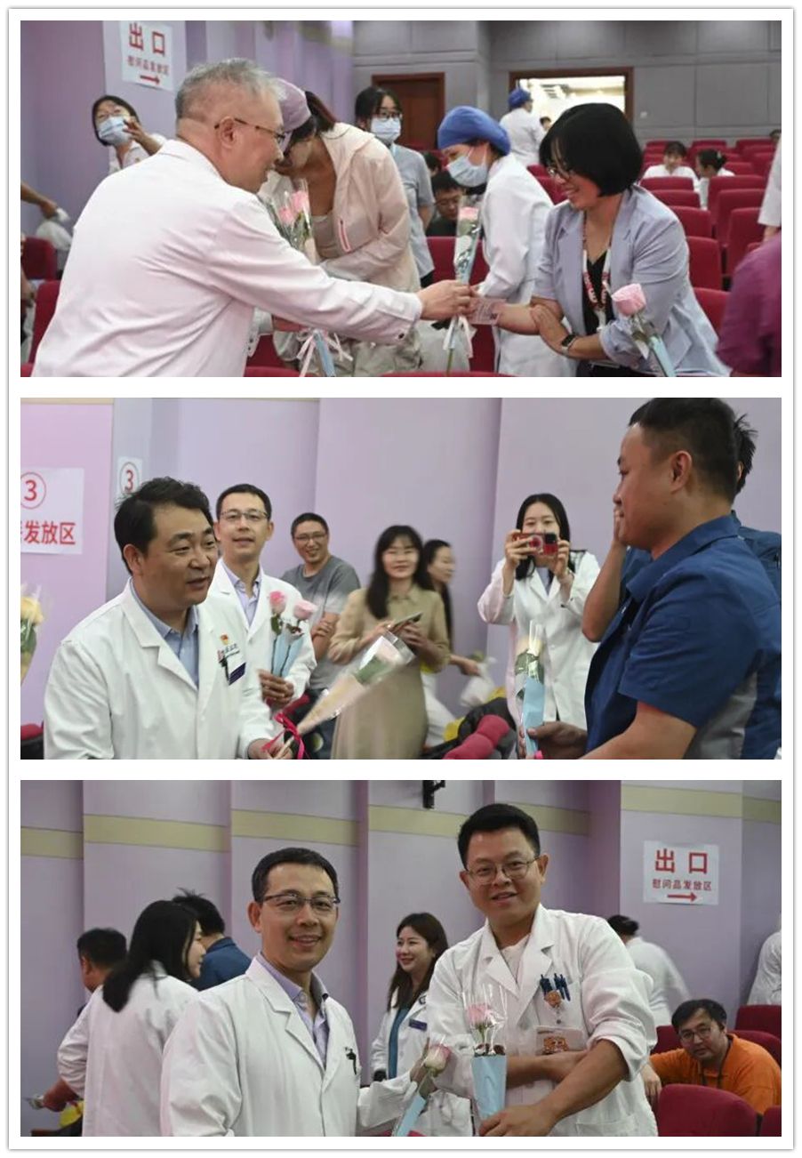 党委书记金昌晓来到献血活动现场时,科学报告厅内气氛热烈、秩序井然。他亲切慰问了参与无偿献血的医务人员,为他们送上鲜花、与大家合影留念,并嘱咐大家注意休息,感谢他们的付出。随后,党委副书记姜雪、工会常务副主席刘温文也来到现场,向献血人员献花,并表示慰问和感谢。