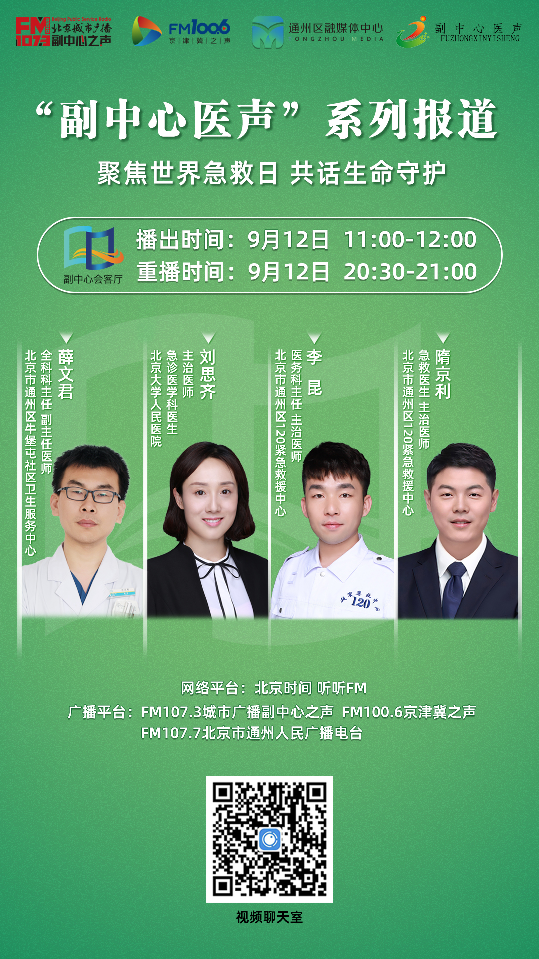 在“世界急救日”到来之际,通州区120紧急救援中心的主治医师李昆、隋京利受邀做客北京城市广播副中心之声与通州区融媒体中心联合打造的大型融媒体栏目《副中心会客厅》,带来了一场实用且权威的急救知识科普,助力提升公众自救互救能力,为市民的生命安全筑牢防线。