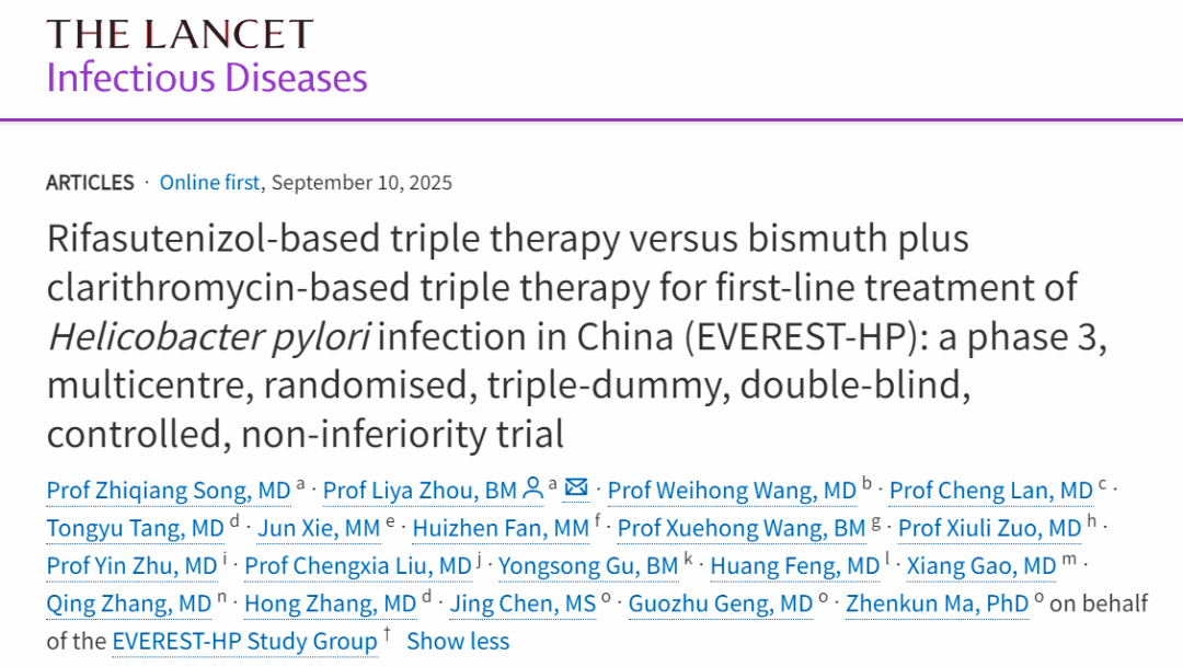 2025年9月10日,北京大学第三医院消化科周丽雅/宋志强教授团队带领全国40家医疗机构消化疾病诊疗中心在感染病学领域顶级期刊《柳叶刀-感染疾病》(The Lancet Infectious Diseases IF: 31.0)在线发表最新研究成果:Rifasutenizol-based triple therapy versus bismuth plus clarithromycin-based triple therapy for first-line treatment of Helicobacter pylori infection in China (EVEREST-HP): a phase 3, multicentre, randomised, triple-dummy, double-blind, controlled, non-inferiority trial(含利福特尼唑三联方案对比克拉霉素三联加铋剂方案在中国幽门螺杆菌感染初治患者中的根除治疗研究:一项3期、多中心、随机、三重模拟、双盲、对照、非劣效性试验)。