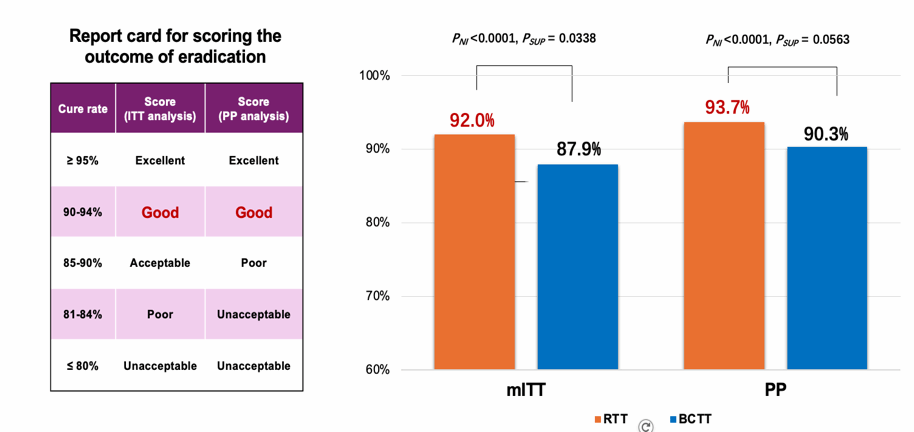 研究结果显示,以利福特尼唑为基础的三联方案(利福特尼唑400mg+雷贝拉唑20mg+阿莫西林1000mg,每日两次,14天疗程)对比克拉霉素三联加铋剂方案(克拉霉素500mg+雷贝拉唑20mg+阿莫西林1000mg+铋剂240mg,每日两次,14天疗程),在主要分析人群中根除率实现非劣效(92.0% vs. 87.9%),在多耐药人群中实现优效(89.9% vs. 87.9%),而临床不良反应发生率更低(37% vs. 53%)。