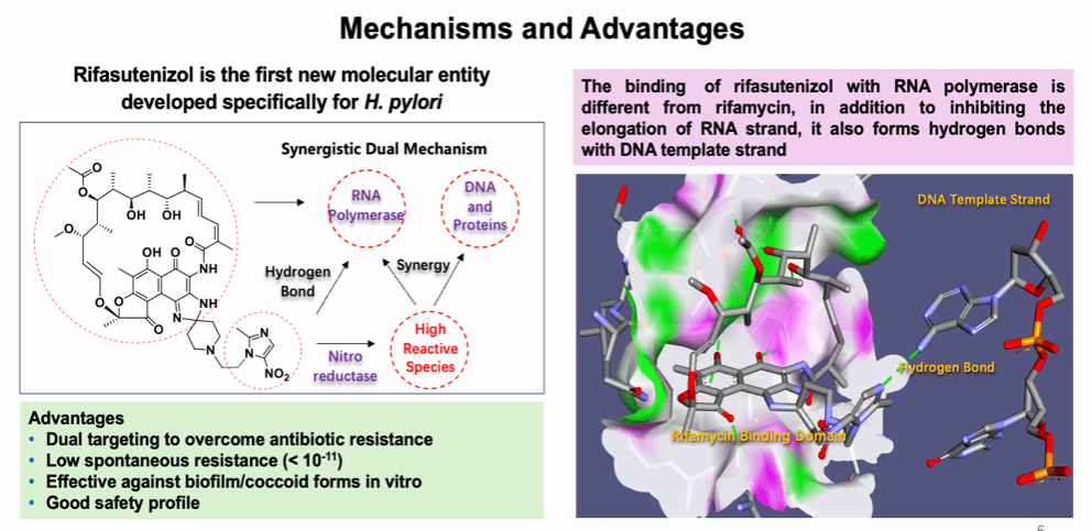 利福特尼唑是我国自主研发的全球首创新型分子实体药物,专门针对幽门螺杆菌感染研发,具有多靶点协同作用机制(利福霉素-硝基咪唑偶联)。相关基础和临床研究结果均显示,幽门螺杆菌对该药物普遍敏感,最小抑菌浓度低,能有效克服幽门螺杆菌高耐药问题,而且表现出良好的安全性。由于耐药、可及性差、过敏反应多见等原因,目前我国幽门螺杆菌治疗相关抗生素选用面临较多困难,利福特尼唑的问世和应用将很好地解决这一棘手问题,大大提高幽门螺杆菌感染的根除疗效。