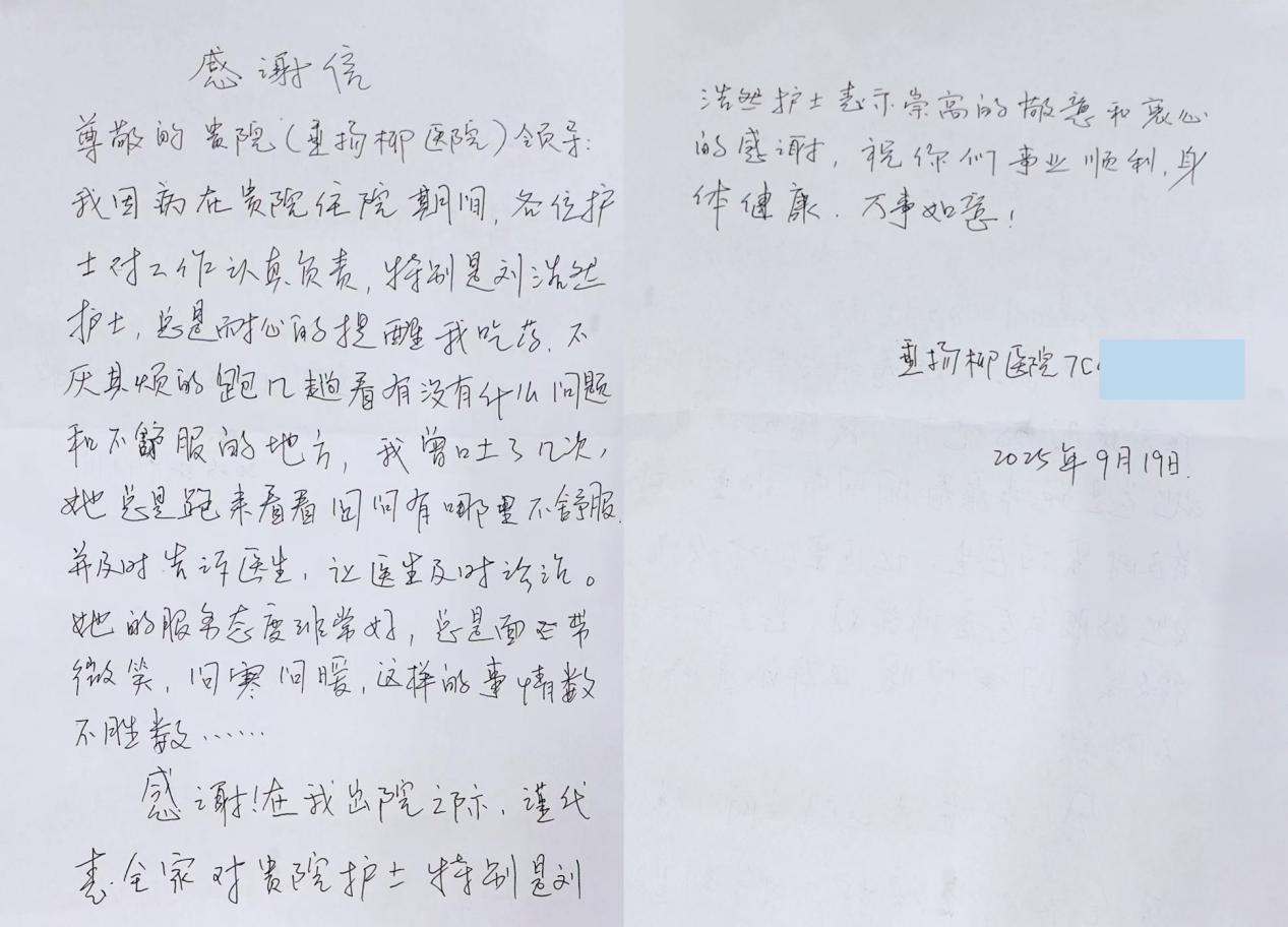 皮女士在感谢信中写道:“每一位护士都认真负责,尤其是刘浩然护士,她的细心和耐心让我心里特别暖。”这封感谢信不仅是对护理团队专业能力的肯定,也体现了医患之间的深厚信任。