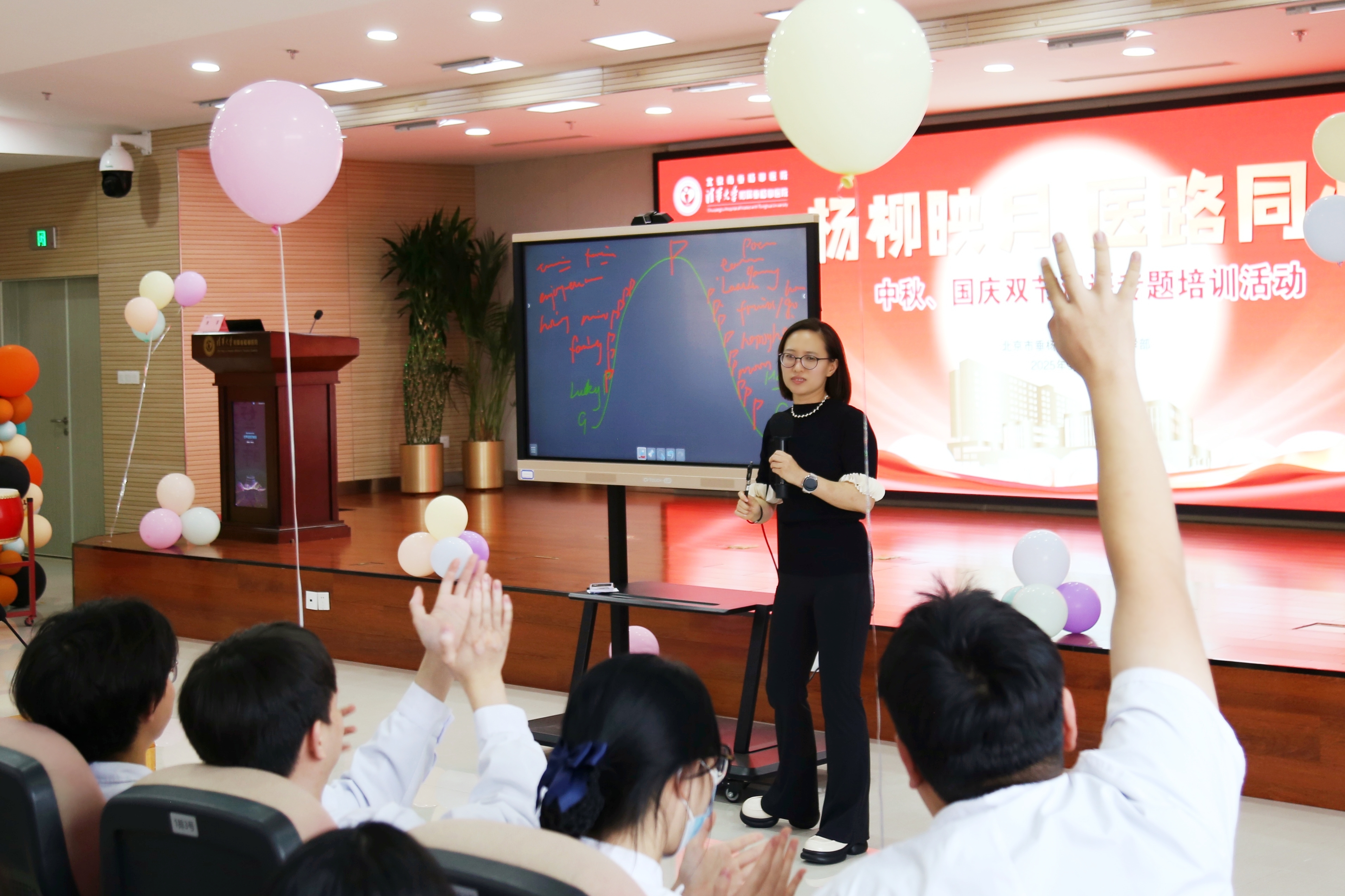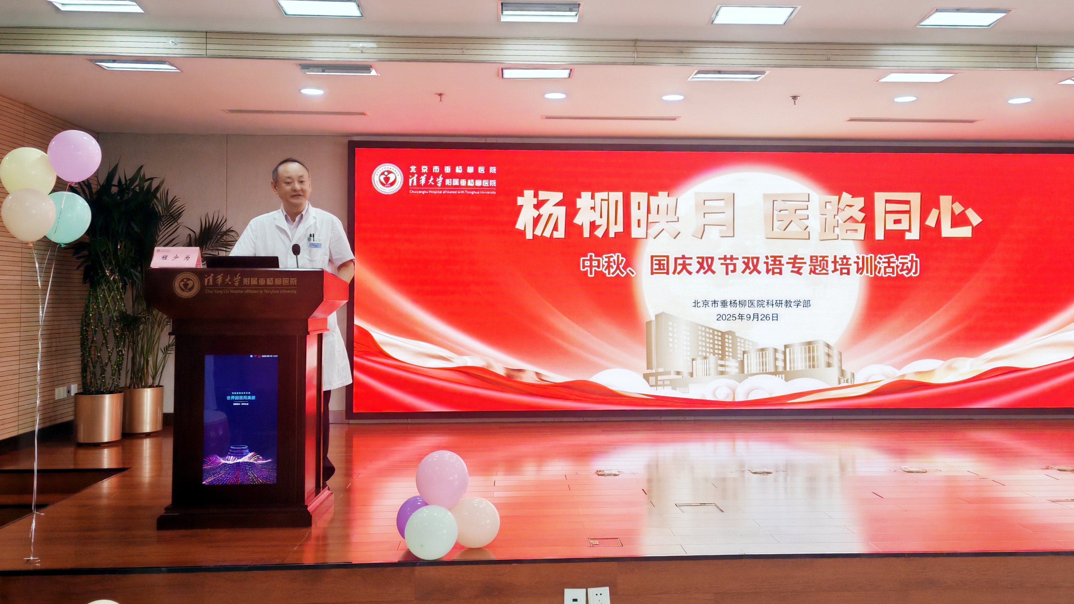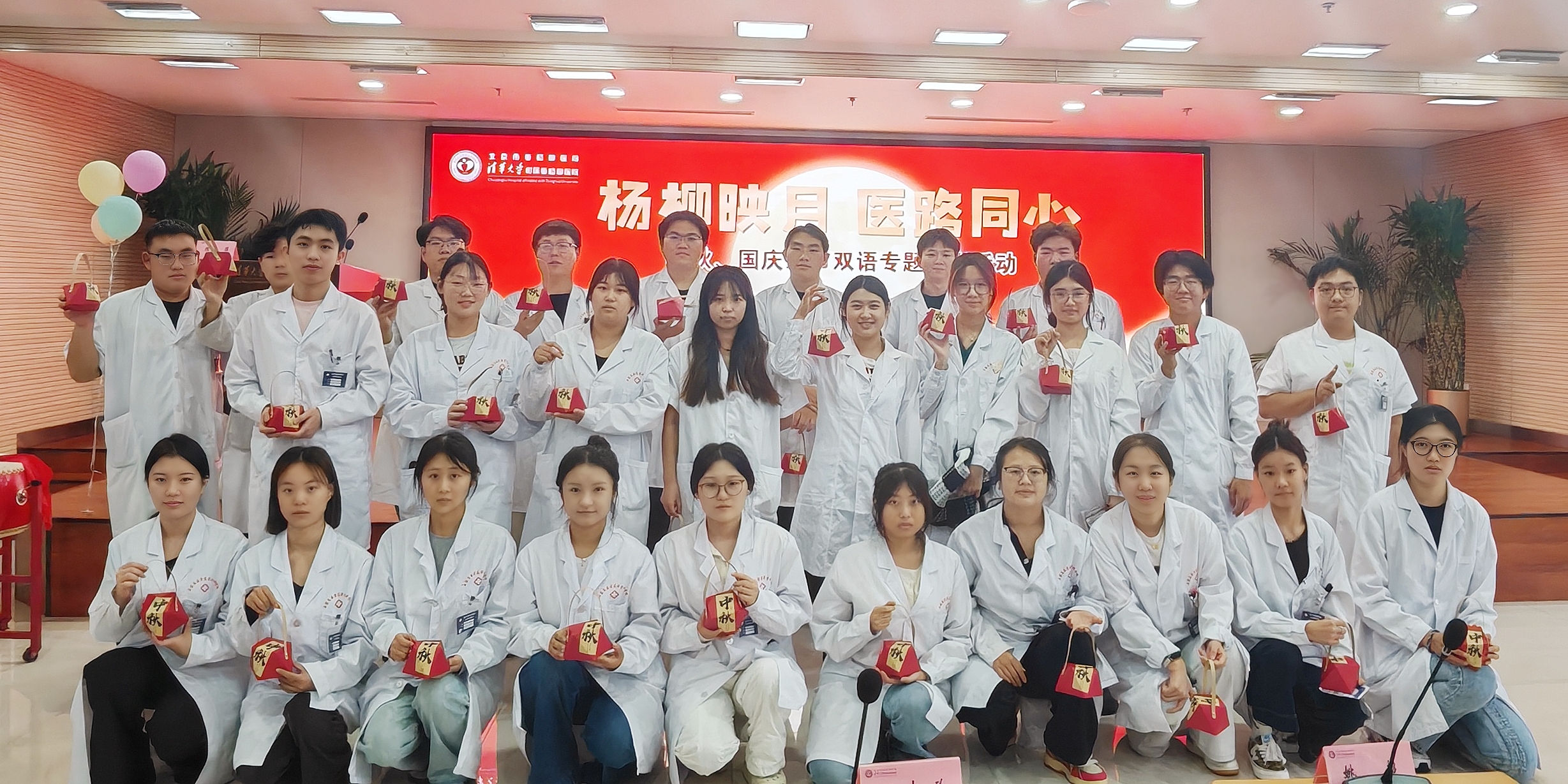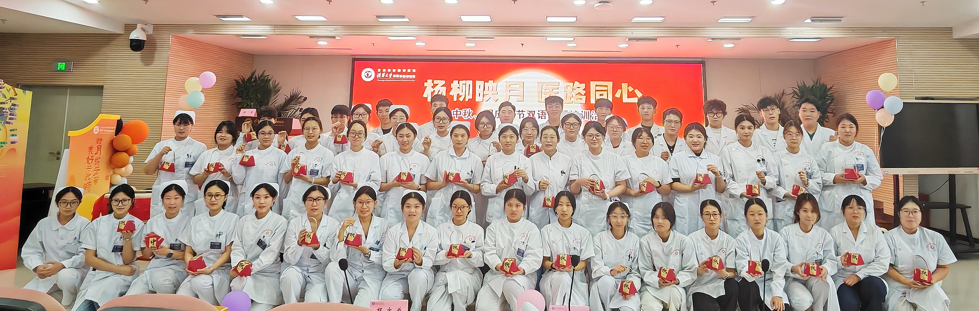 为弘扬优秀传统文化,营造温馨和谐的节日氛围,同时提升师生团队凝聚力,在中秋、国庆双节来临之际,清华大学附属垂杨柳医院科研教学部于9月26日在医院报告厅及咖啡厅精心策划并成功举办了“杨柳映月医路同心”双节双语主题活动。本次活动吸引了华北理工大学、河北医科大学、石家庄医学高等专科学校、北京卫生职业学院、北京劳动保障学院等全体实习生及全科住院医师170余人踊跃参加。