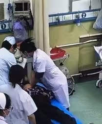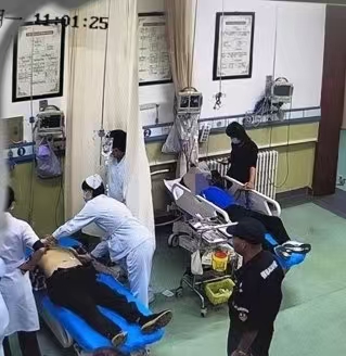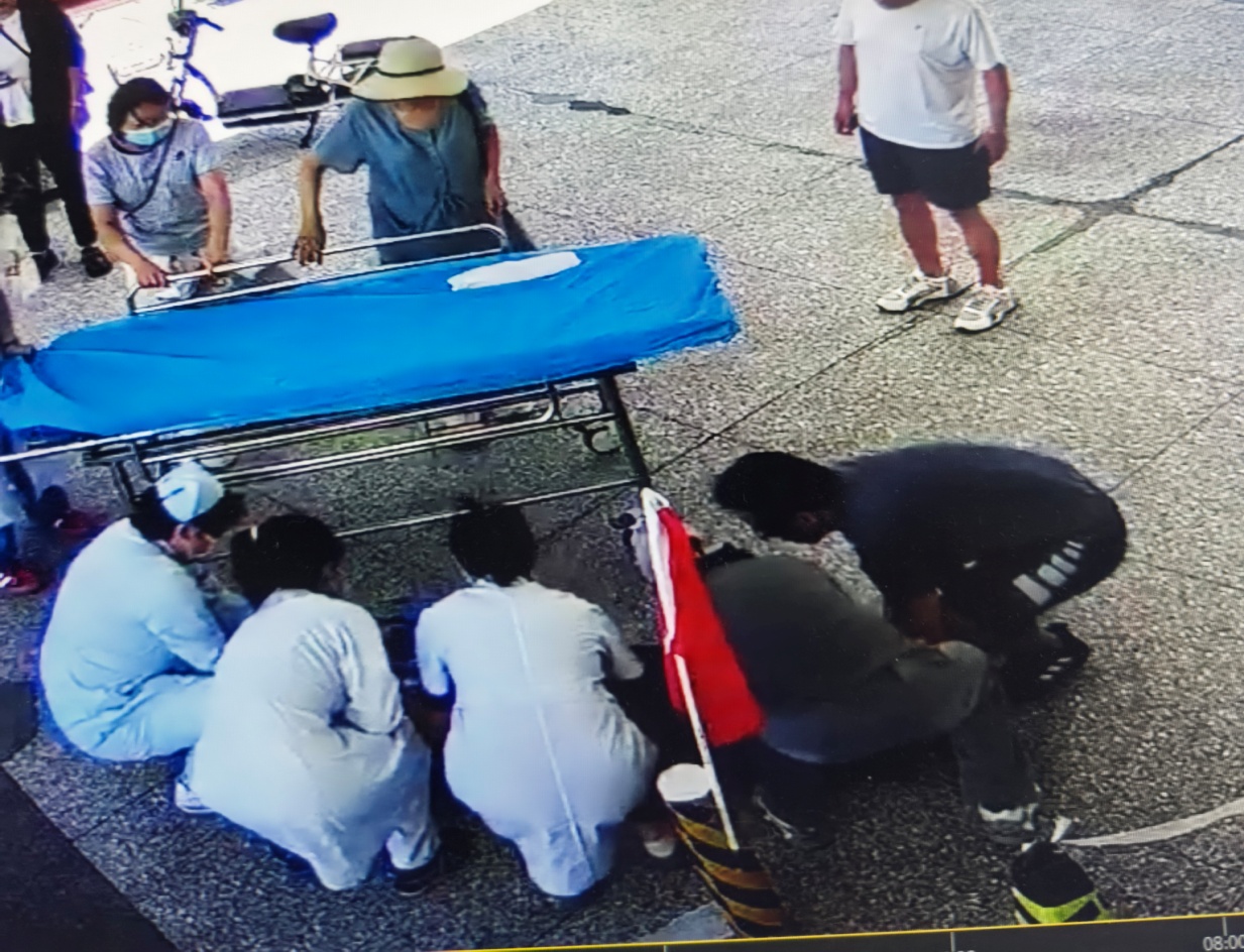 9月8日中午,急诊内科门口一名热心路人紧急呼救,“医生,有人在大门口昏倒了”,事发地距离急诊几米外的门诊大门口,急诊内科医生孟维迅速呼叫护士后,率先奔赴现场,发现患者意识丧失,呼叫无应答,四肢抽搐,口唇紫绀,口角少量泡沫痰,随即开始胸外按压,1分钟后急诊护士景欣及安保人员推抢救床抵达,迅速将患者转运至急诊抢救室。