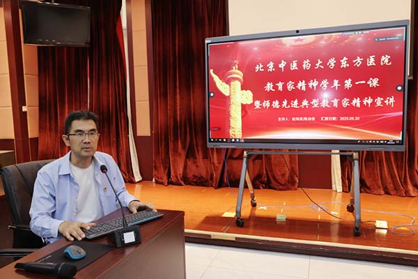 2025年9月30日下午,北京中医药大学第二临床医学院(东方医院)举办“教育家精神学年第一课”暨师德先进典型宣讲活动。活动采取线上线下相结合的方式,全院23个科室、教研室的220余名教师及党员代表参会,实现教师、党员全覆盖,旨在以教育家精神筑牢师资思想根基,推动中医药临床教学提质增效。