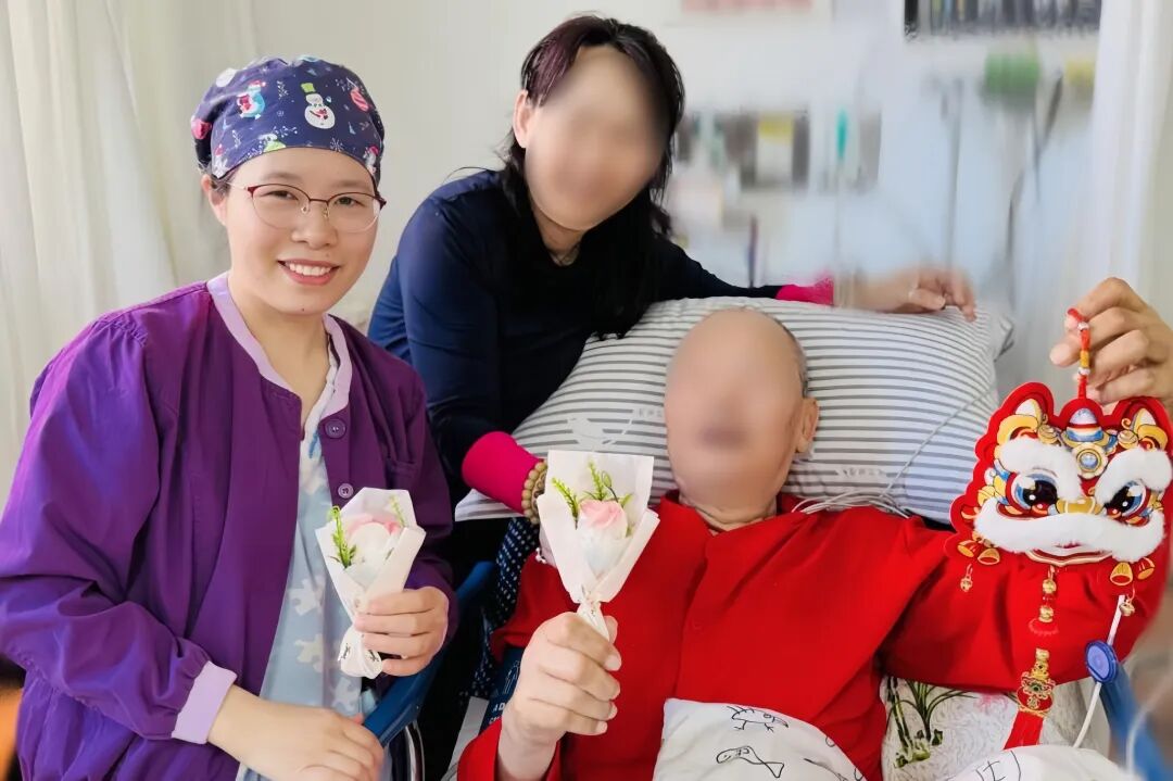 出院前夕,吴爷爷在医院迎来了八十八岁生日。家人为吴爷爷准备了红绸唐装,这抹红色映照在医院白色的墙面上,如同吴爷爷恢复红润的面色。女儿们唱生日歌,护士长捧着小花和刺绣挂件加入了庆生小队:“吴爷爷,米寿安康!”房间内最年长的爷爷此刻开心得像个孩子,不断地用手摩挲着那虎狮刺绣:“这挂件让我忆起儿时过年的热闹场景,那熟悉的中国味儿,是记忆深处家的模样。”温馨的生日氛围也感染了留观区的其他患者,大家纷纷向吴爷爷送上祝福,祝愿他早日康复。