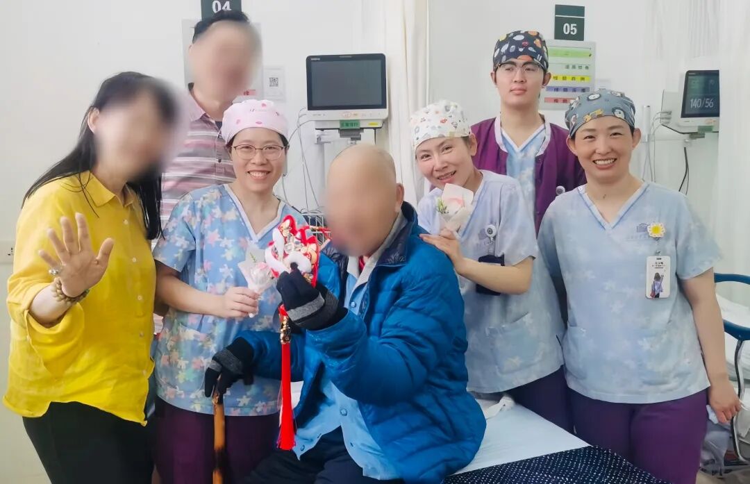 出院那天,吴爷爷脸色红扑扑的,脚步也轻了。护士刚叮嘱完吃药细节,吴爷爷家人提议和医院这些“临时的家人”合影,笑纹里裹着康复的喜、关爱的暖。吴爷爷牵着那枚刺绣挂件走出医院……