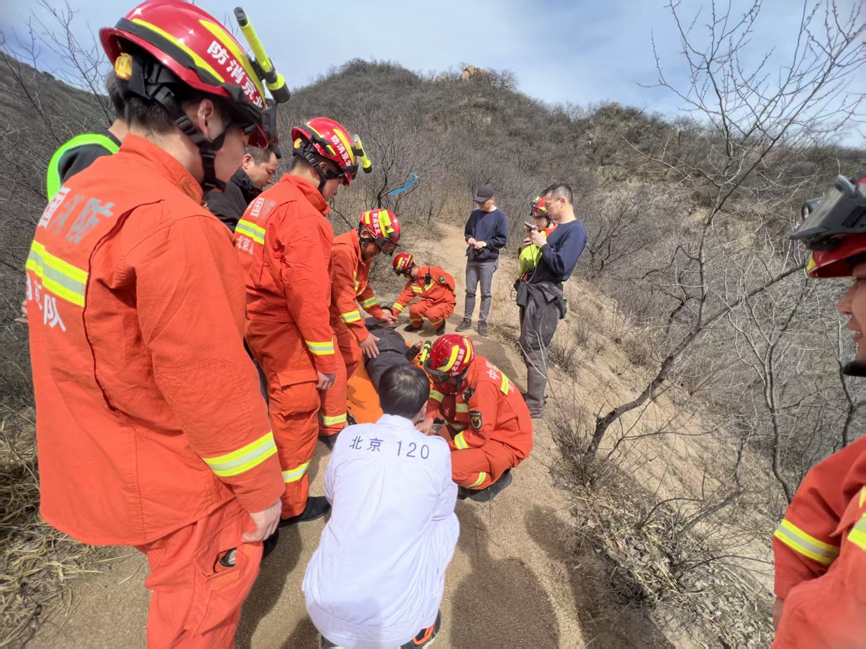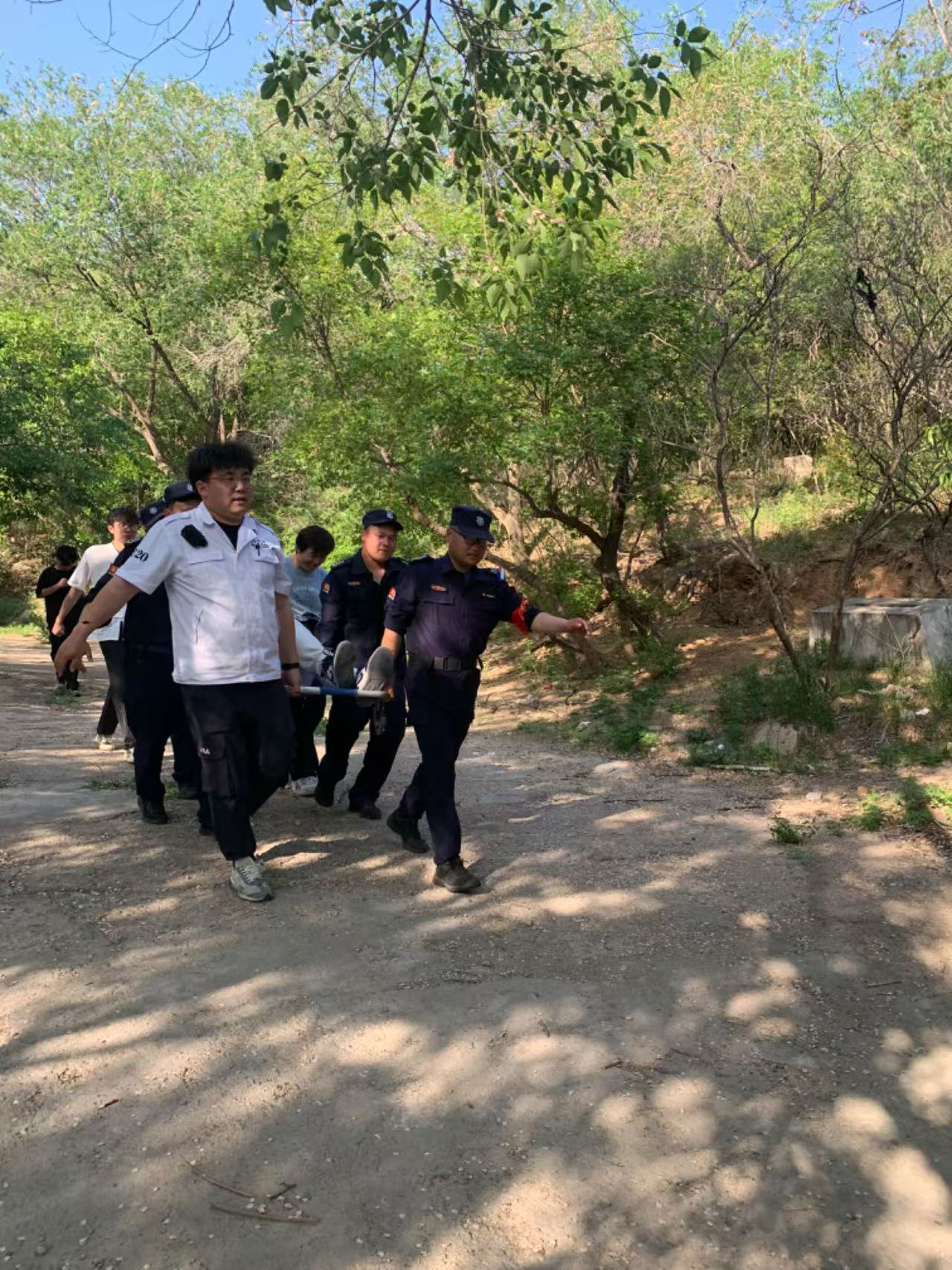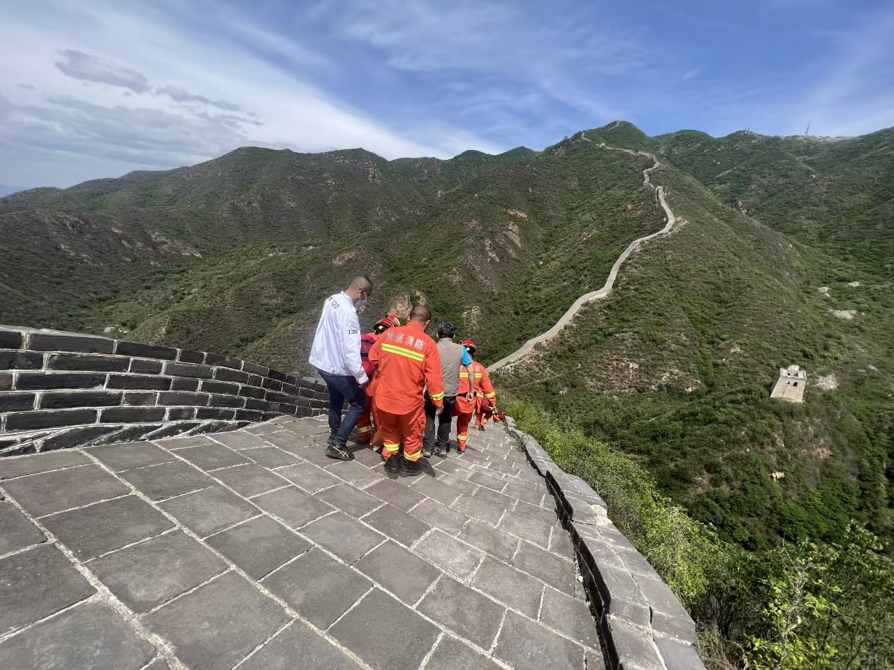 长城蜿蜒起伏,地势险峻,四季气候多变,救援难度极大,但八达岭镇社区卫生服务中心的医护人员从未退缩。2023年5月,帮水峪村花家窑长城的救援至今让人记忆犹新。当时,一名加拿大籍华人在攀爬长城时不慎滑倒,左脚踝严重受伤,无法站立。接到求助电话时,急救车组迅速联系消防部门支援,抵达现场后才发现,这段长城非常险陡,而且当时地表温度已突破50℃,滚烫的城砖仿佛要灼伤皮肤。医护人员只能踩着消防队员架设的伸缩梯,手提十几斤重的急救箱,在没有扶手的城墙上手脚并用地攀爬。缺氧、恶心、呕吐……极端环境下,没有人停下脚步。经过4小时的接力救援,患者终于被安全转运至医院。家属紧握医护人员沾满汗水的手,一遍遍说着“谢谢”,此时医护人员的衣服早已被汗水浸透。