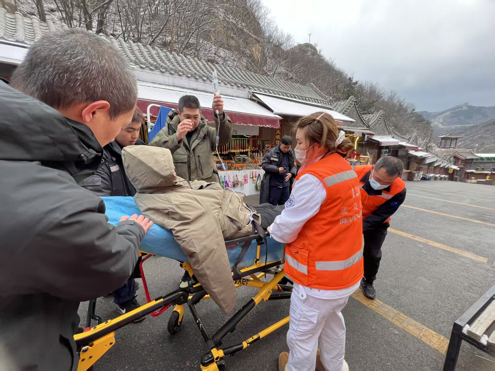 这样的场景在长城上并不罕见。2024年11月的一个雨雪天,八达岭长城北八楼有游客摔伤。急救人员踩着结冰的台阶,一步一滑地向上攀爬,60分钟的路程里,既要安抚电话中焦急的患者,又要提防脚下的危险。到达现场后,他们迅速为疑似踝关节骨折的患者固定支具,最终在消防人员配合下将人安全送下山。回到急救站时,湿透的白大衣冻得发硬,队员们的双腿还在不住打颤。