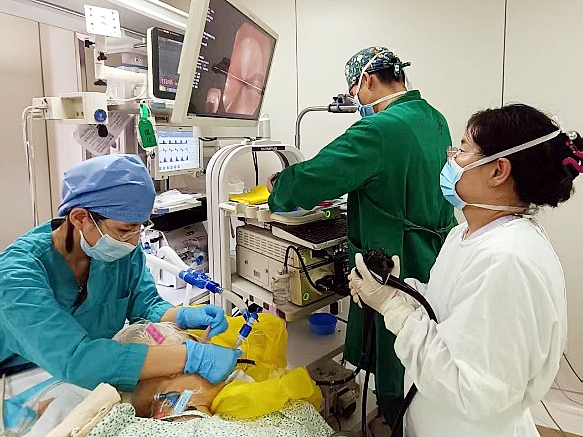 术后第二天,患者突发呕吐大量咖啡色胃内容物,伴随血压下降与意识丧失,病情急剧恶化。重症医学科迅速开展抢救,实施心肺复苏、呼吸机辅助通气及循环支持。消化内科团队在重症监护条件下紧急完成床旁胃镜,明确出血点并成功止血。在多学科有条不紊的配合下,患者当晚生命体征趋于稳定。