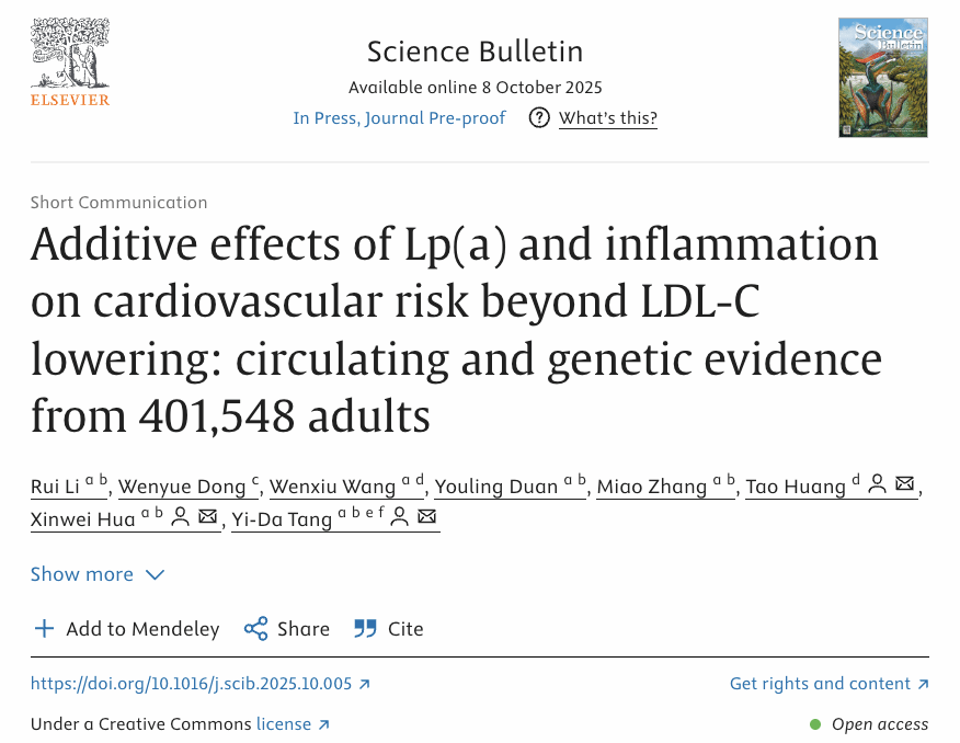 2025年10月8日,北京大学第三医院唐熠达教授、花欣炜研究员,北京大学公卫学院黄涛教授团队在Science Bulletin发表题为“Additive Effects of Lp(a) and Inflammation on Cardiovascular Risk Beyond LDL-C Lowering: Circulating and Genetic Evidence from 401,548 Adults”[Lp(a)与炎症在LDL-C降低外对残余心血管风险的叠加效应研究]的研究论文。