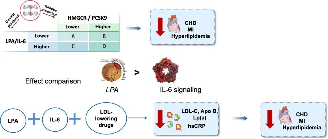 本研究旨在循环及遗传水平上,评估并比较在LDL-C降低基础上,联合降低Lp(a)或抑制IL-6通路对心血管风险的影响,并进一步探讨三者同时抑制是否能带来额外的心血管获益。研究团队基于英国UK Biobank队列超过40万名欧洲人群,采用2×2析因孟德尔随机化(MR)分析,并结合循环水平验证,系统评估了Lp(a)与LDL-C靶点(HMGCR,PCSK9)的联合抑制、IL-6通路与LDL-C靶点(HMGCR,PCSK9)的联合抑制,以及三者同时抑制对血脂及炎症谱改善和对心血管事件风险降低的作用。