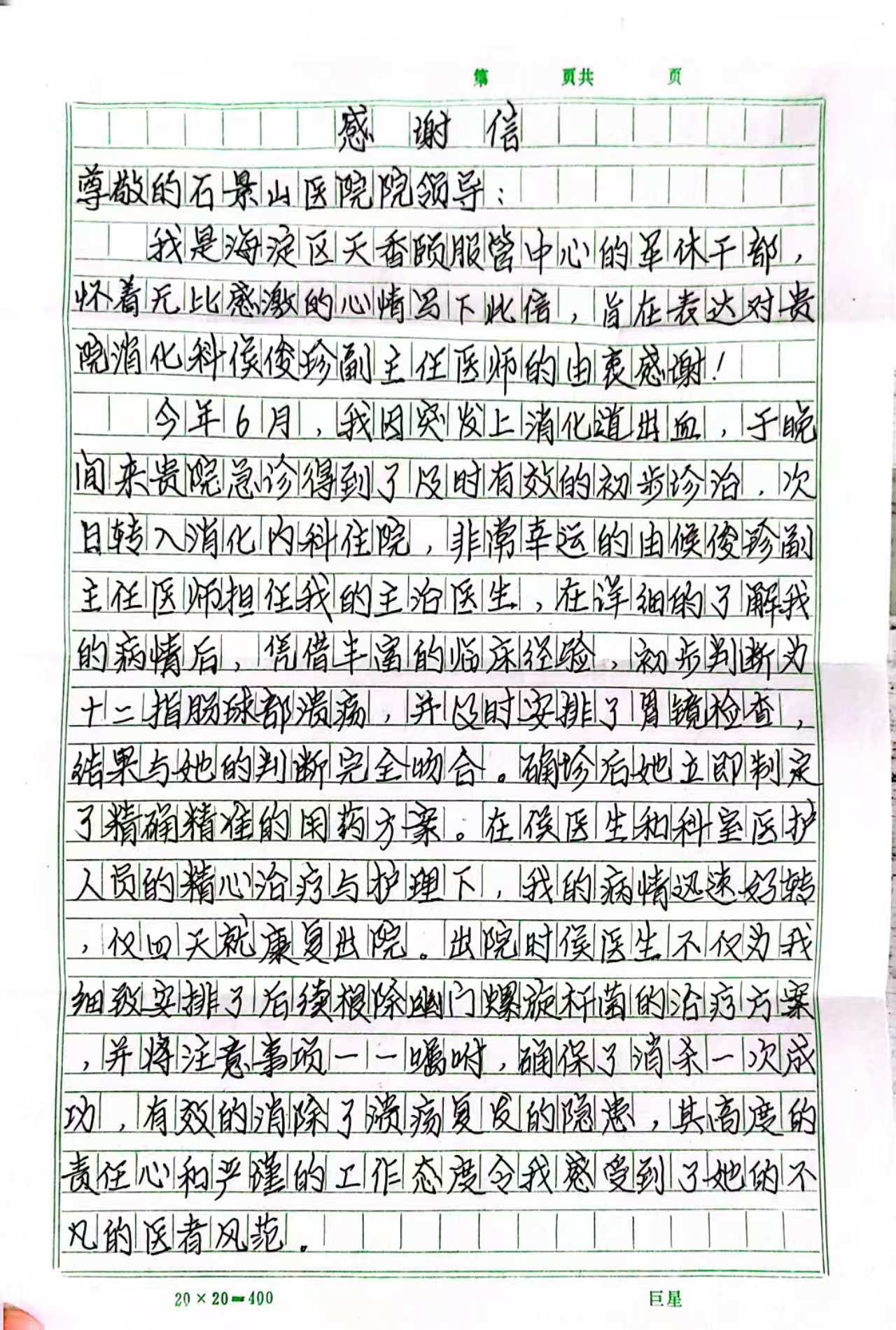 近日,首都医科大学附属北京朝阳医院石景山医院消化内科侯俊珍副主任医师就因一份“医生”的坚持,帮助患者王先生(化名)化解了一场潜在的健康危机,并因此收到了一封情真意切的亲笔感谢信。