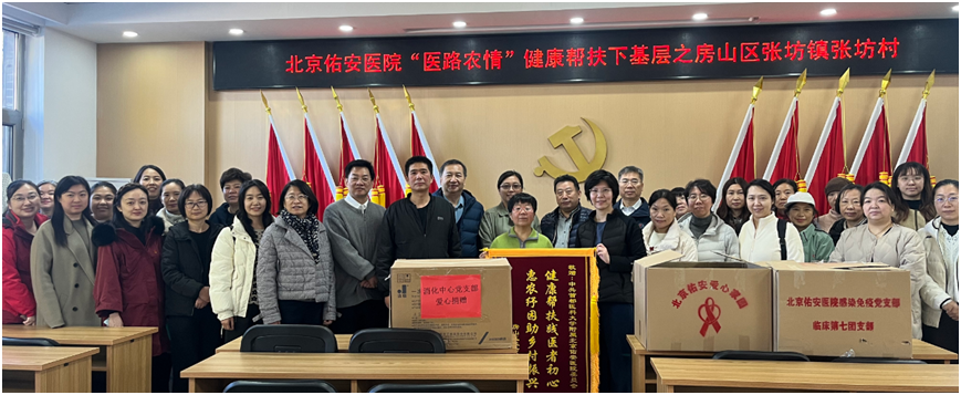 在医院党委的大力推动下,2025年北京佑安医院医路农情健康帮扶品牌服务张坊镇所辖村党支部、马安村、张坊村、东关上村、兰馨书屋等抗日模范村、受灾严重村和山区民间公益组织,通过面向村民的义诊、健康宣教、发放卫生用品,面向村委会的洪涝灾害后的卫生防疫培训,面向乡镇卫生院的三基三严培训等不同维度的帮扶,受众800余位村民、11个村党支部、1个卫生服务中心、1个镇政府。