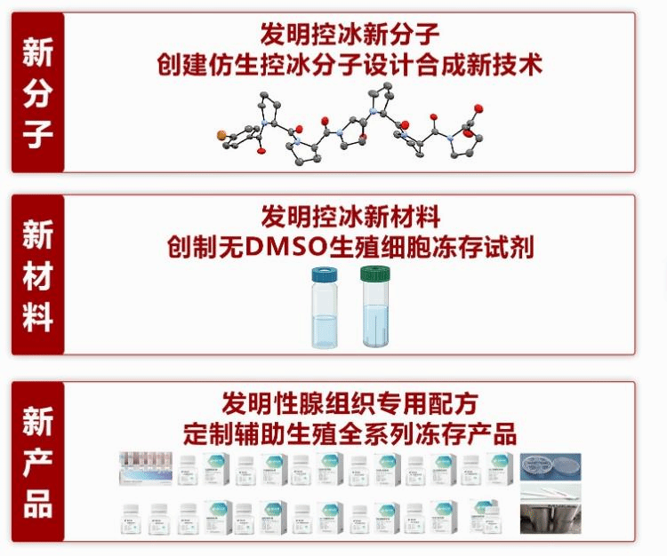 为此,跨学科合作团队创新性地从自然界耐寒生物的抗冻机制中获得启发,系统揭示了天然抗冻蛋白控冰新机制,开发了高效控冰分子与安全低毒冻存材料,研制出适用于生殖细胞及性腺组织的系列冻存试剂,显著提高了冻存复苏后的细胞存活率与技术稳定性,助力创建新一代辅助生殖仿生控冰冻存技术。