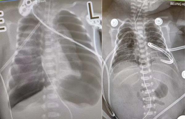 小星星生后很快出现了呼吸困难、肤色发花、血压降低、心率增快,胸片提示双肺透光度明显降低,感染指标异常明显,诊断为新生儿呼吸窘迫综合征、重症肺炎、感染性休克,生命告危。儿科医生立即给予呼吸机辅助通气、肺表面活性物质气管内滴入,强有力的抗感染治疗,以及升压、改善循环等一系列抢救措施,终于把生命体征维持在正常范围。