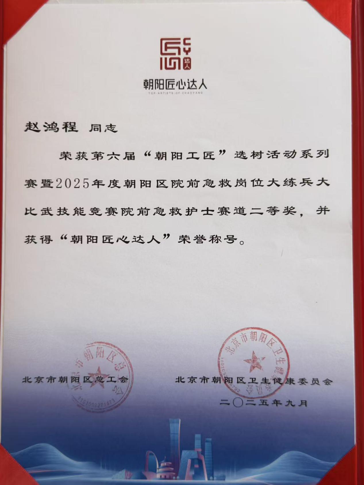 在刚刚落幕的第六届“朝阳工匠”选树活动系列赛暨2025年度朝阳区院前急救岗位大练兵大比武中。我作为清华大学附属垂杨柳医院的一名拥有11年院前急救工作经验的护士,荣幸地代表医院和院前急救团队参赛,并在护士赛道的比拼中获得了第二名。回顾整个参赛过程,我深切感受到技能竞赛对个人专业成长的重要价值。